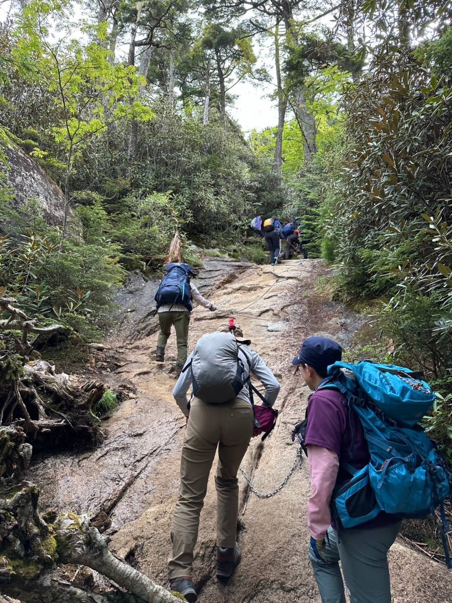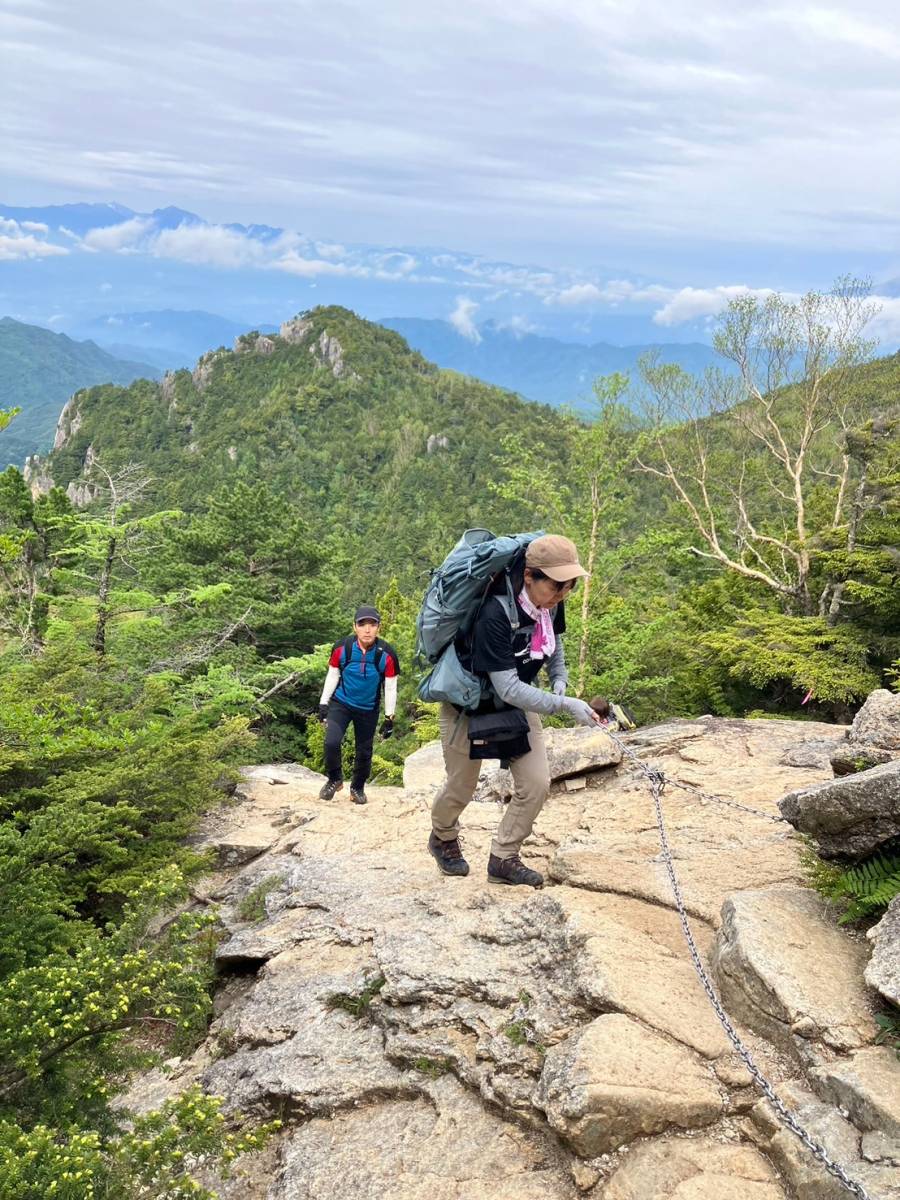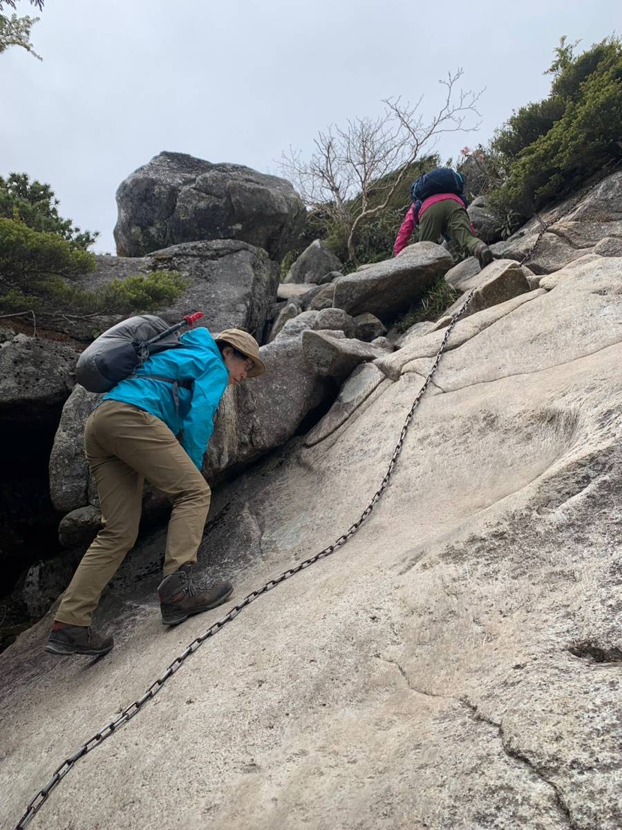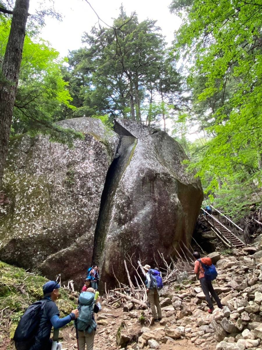 天鳥川源流を渡ると大きな割れ目がある巨大な桃太郎岩が現れ、写真撮影に興じる。この先は岩だらけの急登となる。ハシゴや鎖を頼りに岩場を登る。