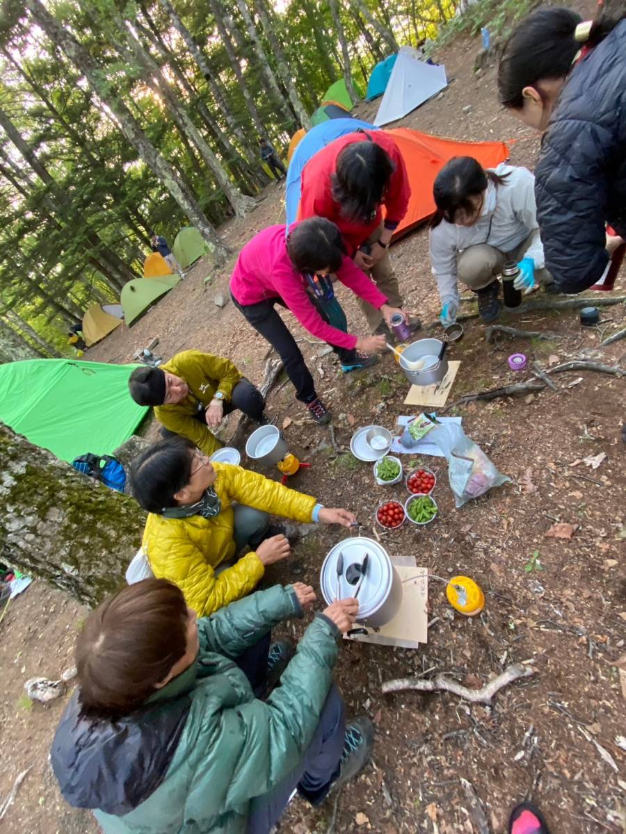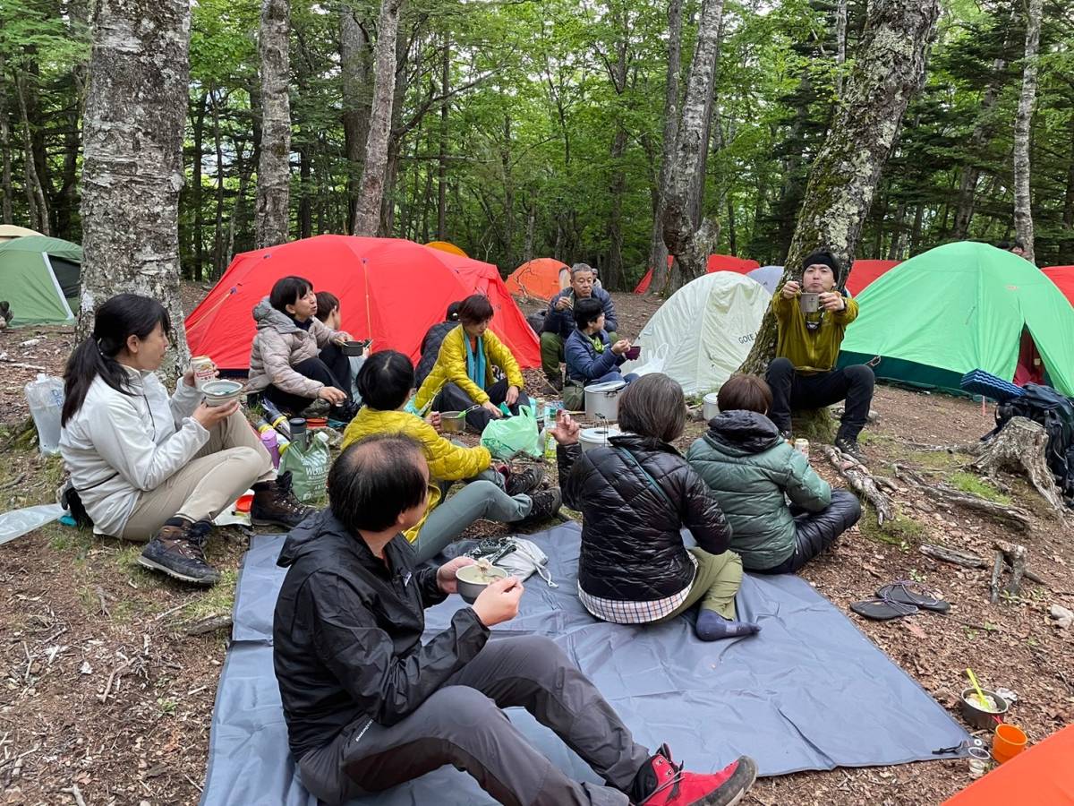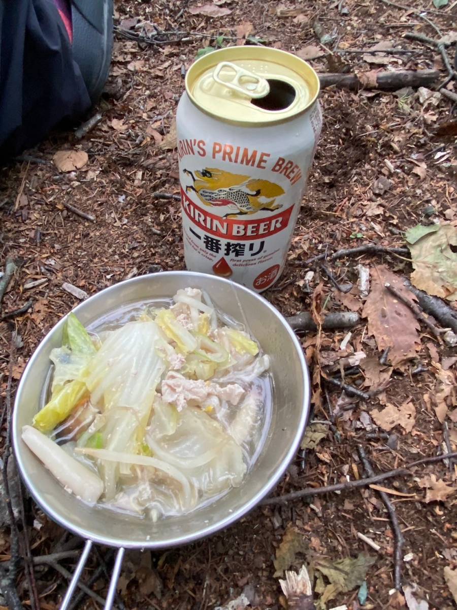 すぐに水汲み、食事準備に取り掛かる。水場は小屋から近く、水量も豊富だった。中島シェフが腕を振るった豚と野菜の煮込み鍋は疲れた体においしく、〆のラーメンもお腹にやさしかった。夕食の跡片付けなどをして、20時30分頃就寝した。