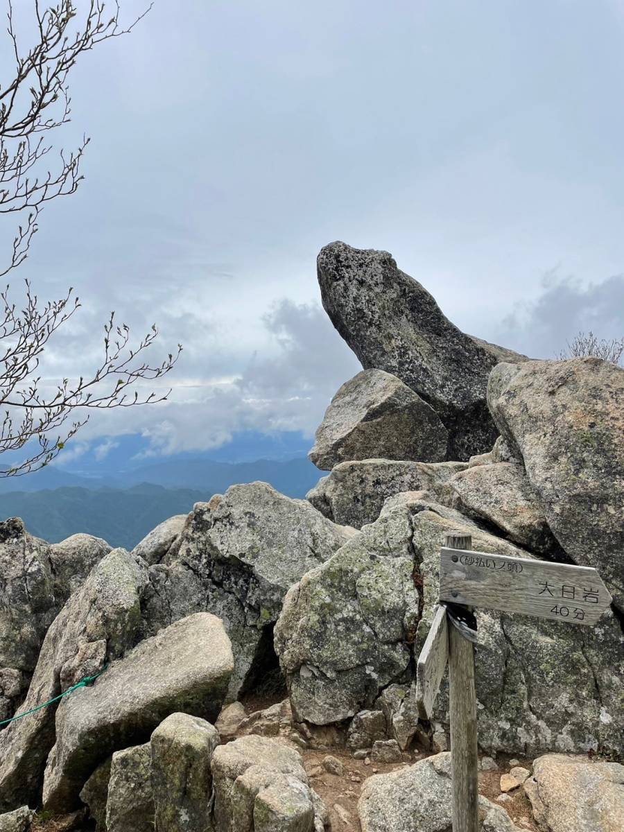 樹林帯の中を登っていく。途中、白峰三山が望めるポイントがあった。鷹見岩への道を右に分け大日小屋の前で、巨大な大日岩を見上げながら一休み。