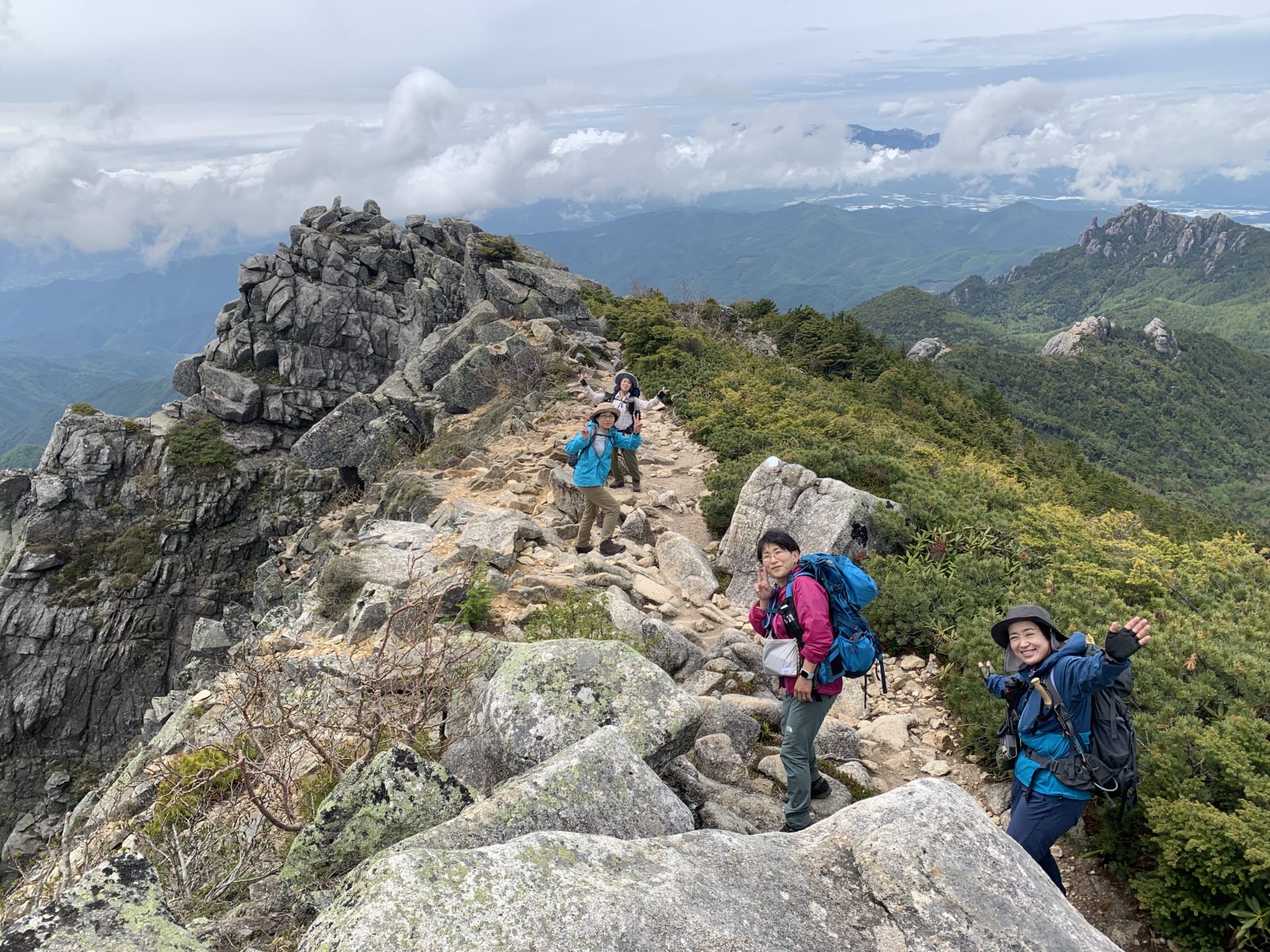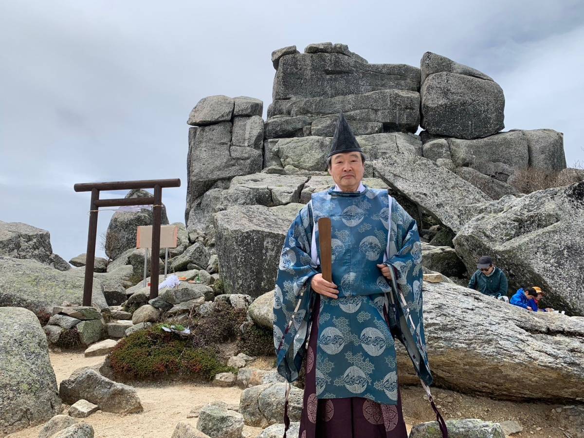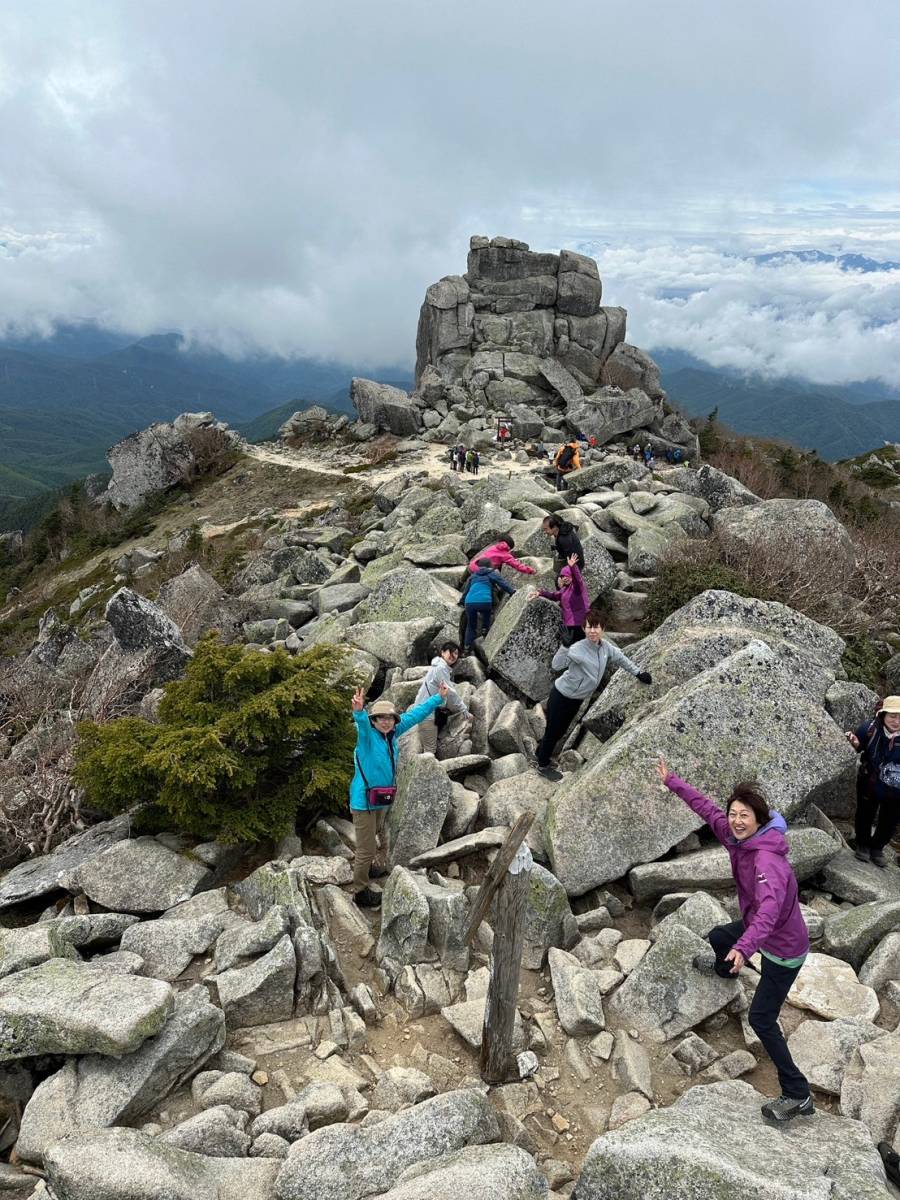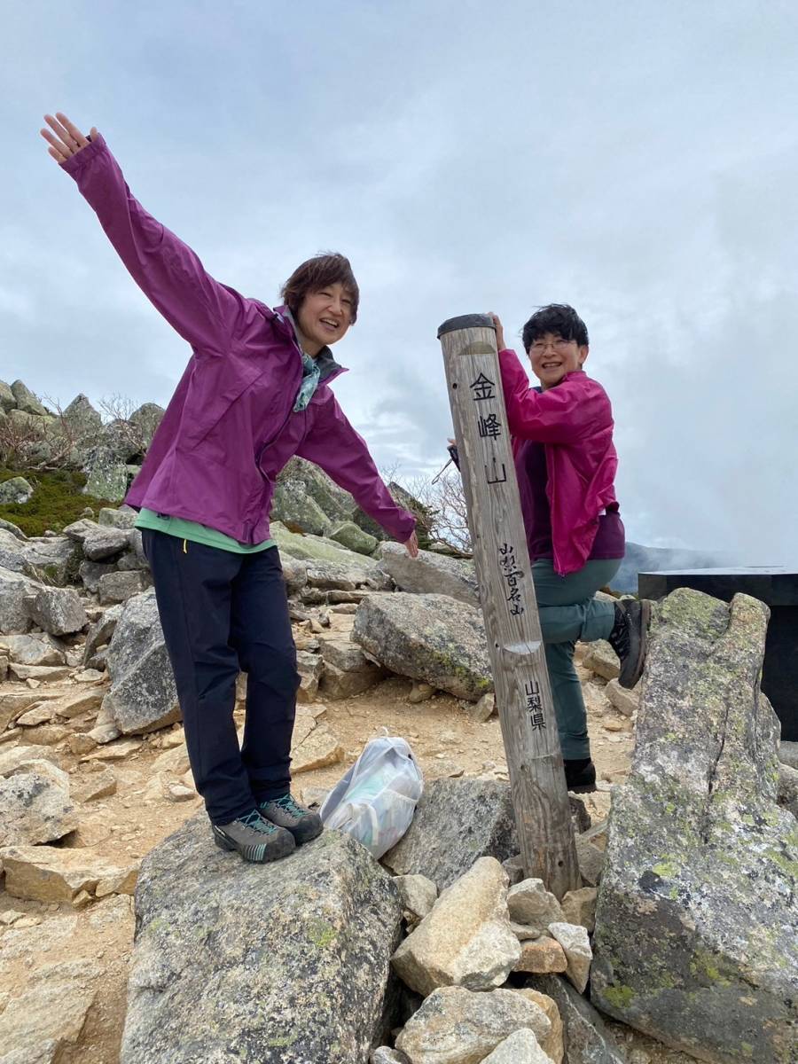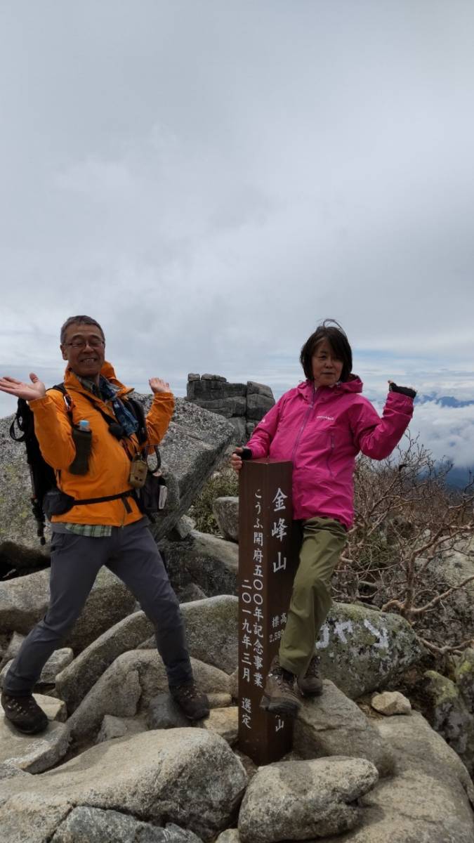 最後の急登をもうひと踏ん張りすると、11:05、金峰山のシンボル、五丈岩が迎えてくれた。驚くことに山開きの神事に遭遇した。大弛峠から登ってきたのか、山頂には幼い子どもの姿もあった。風が強く、五丈岩の陰で各自持参した昼食を取る。五丈岩から岩場を登り、2,595mの金峰山山頂で記念撮影後、往路を戻る。