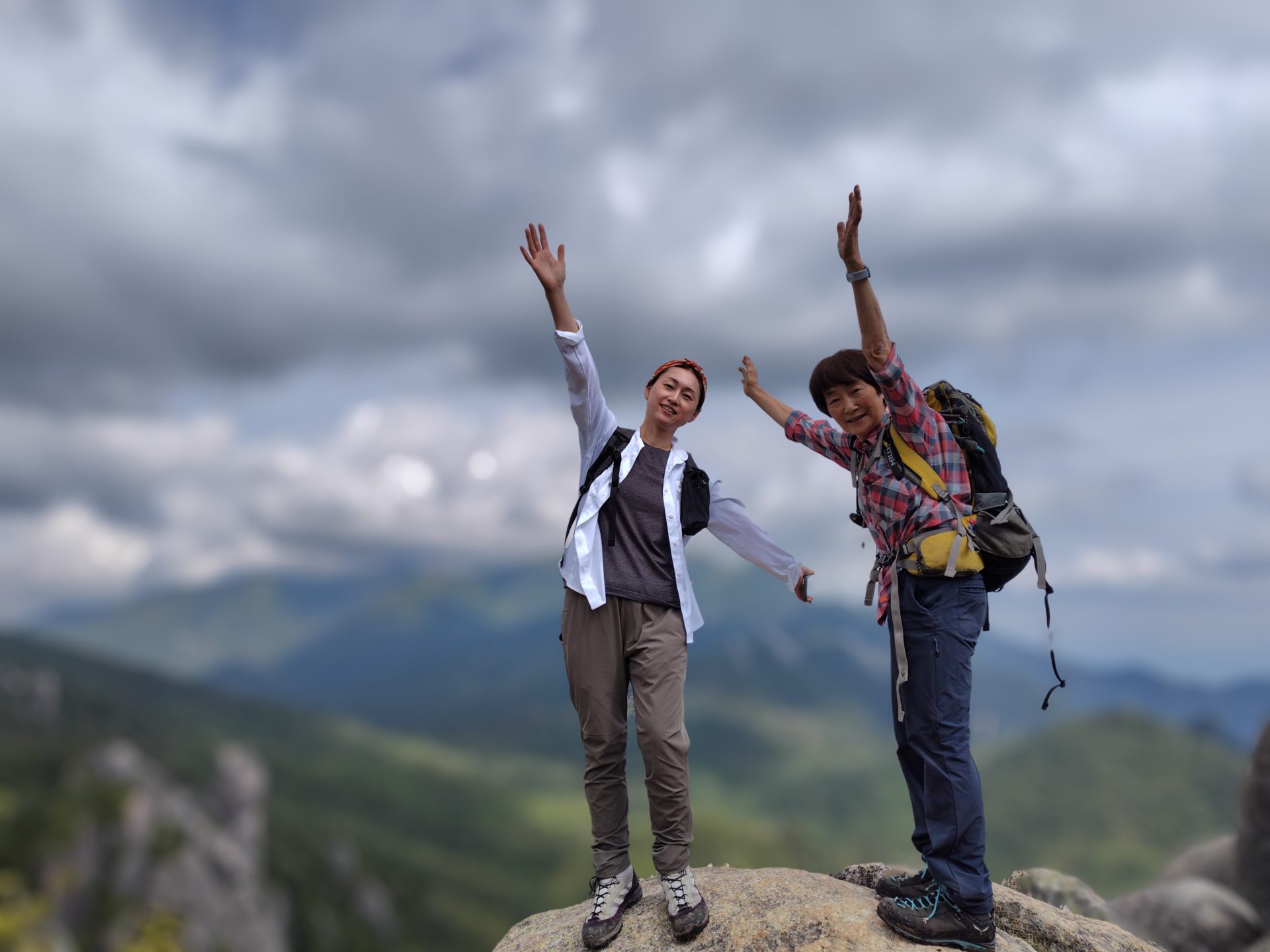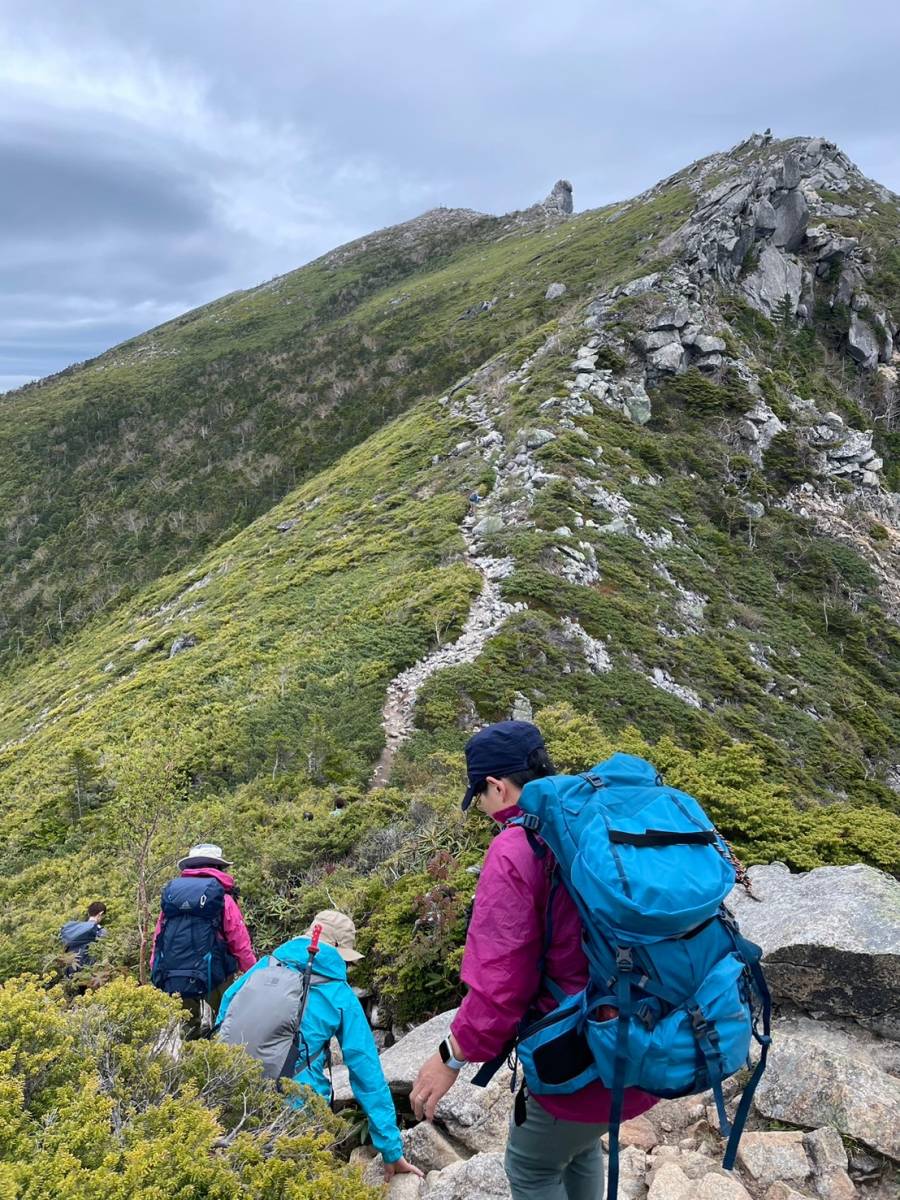 砂払ノ頭に着くと景色が一変し、視界が開けた。ハイマツの中、右に富士山を望みつつ、岩場の続く稜線を進んでいく。稜線上でヘルメットを被った中国からの女性パーティーとすれ違う。
