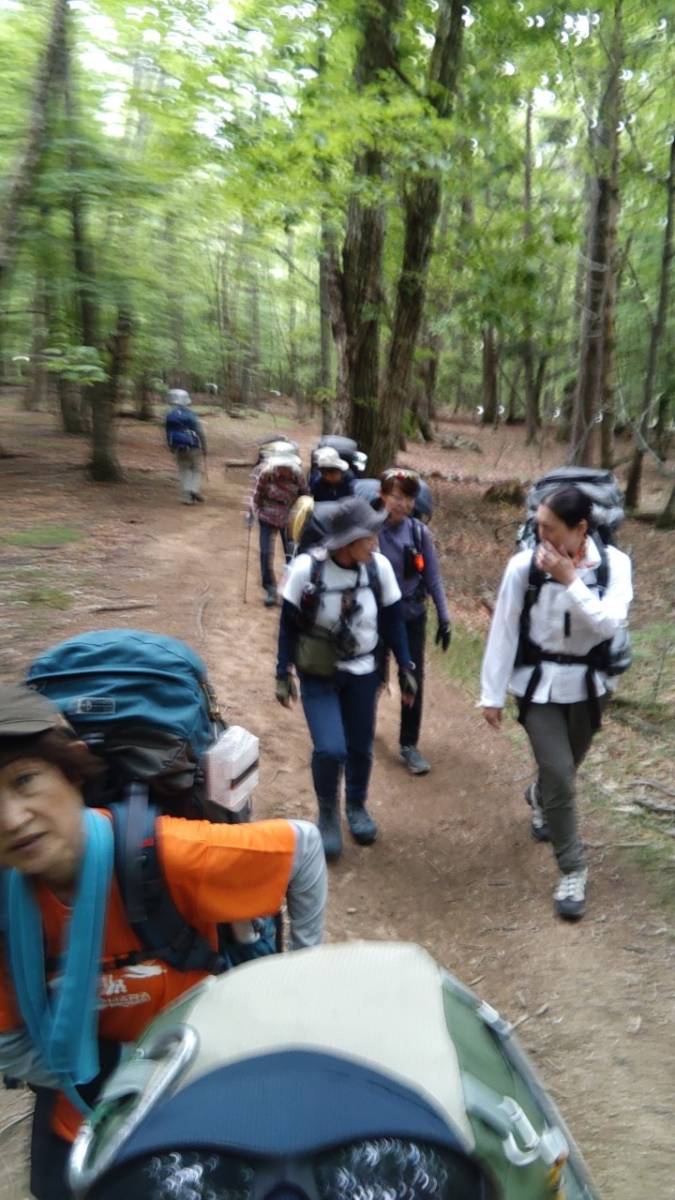 (1日目)第3期中級登山教室1回目の登山実習。テント泊用の大きなザックを背負い、JR韮崎駅に集合する。予約してあった2台のタクシーに乗車し、約1時間で瑞牆山荘に到着。共同装備の受け渡し、トイレ、体操を済ませて、10:15、出発。ハルゼミの大合唱に迎えられ、緑美しい樹林帯の中を登る。
