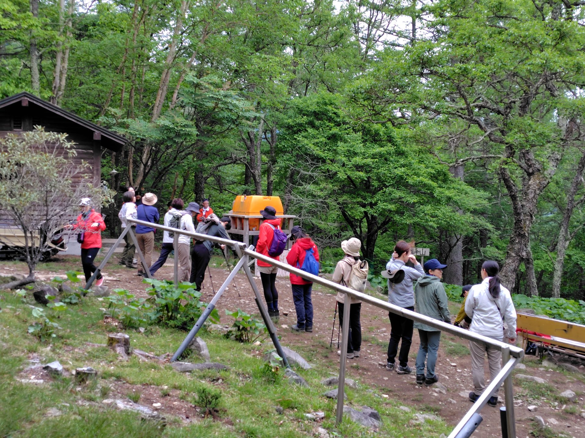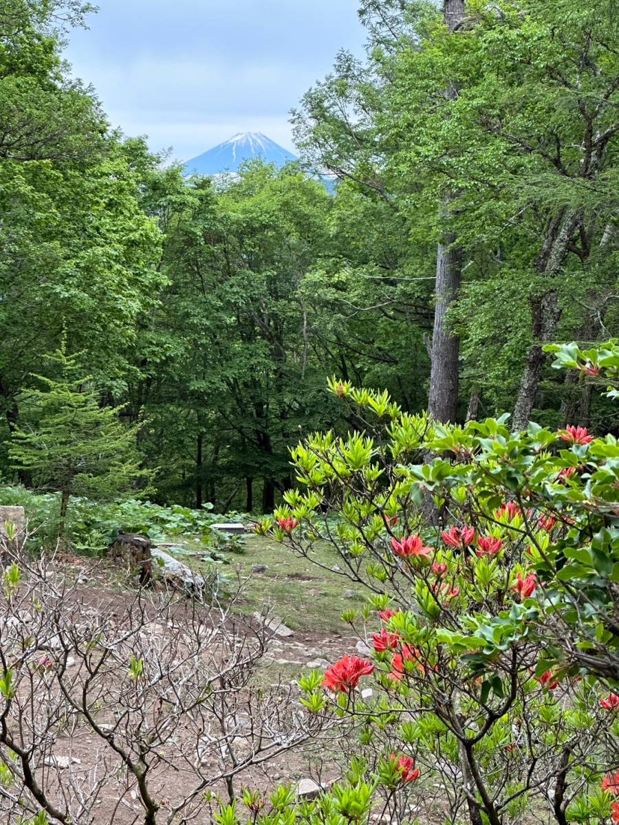 富士見平小屋はレストランもしていた。立ち寄りたい誘惑も・・・。小屋の前から樹間に富士山が見えた。女性用トイレはルームが一つしかなく、行列に並ぶことが多かった。