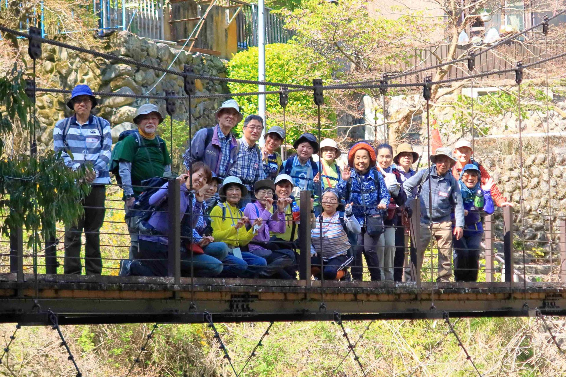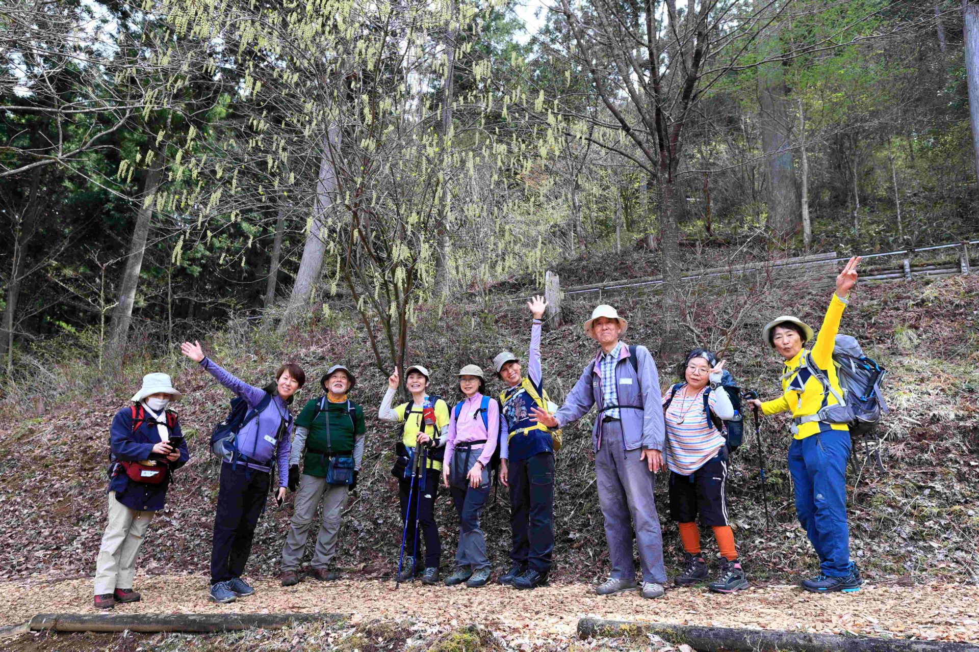 ハイクの出発点である登山園地に着く頃には、青空が見られた。緩やかな登り坂のあと現われた188段の急な石階段をあえぎながら登る。五重塔の広場で休憩。息吹きだした新緑のグラデーションで山が美しい。愛宕山山頂、愛宕神社を通り森林セラピーロードへ入る。気持ちのよい森林浴である。足元にはウッドチップが敷かれて歩きやすい。所々に椅子が設置してある。星空浴用スペース、ヨガスペースも整備されている所でランチ。新旧会員が打ち解けて和やかな雰囲気になる。時折ウグイスの鳴き声も聞こえてくる。キクイタダキやヤマドリもいるようだ。奥多摩総合グランド付近ではソメイヨシノが満開を迎え、花桃・しだれ桜や芝桜は五分咲きだった。山にはミツバツツジ、コブシ、キブシ、ツバキが咲き心を癒してくれる。