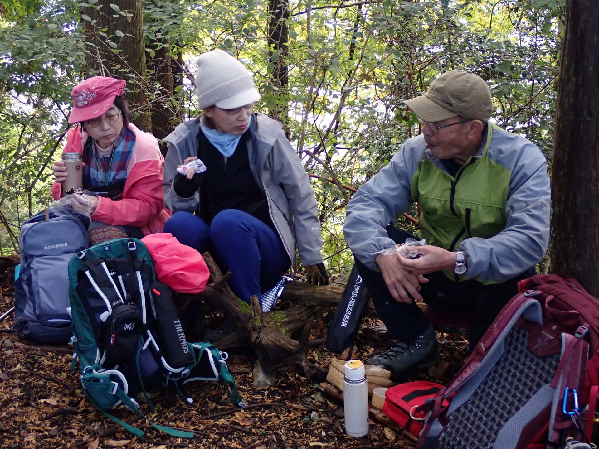 予定よりも短めの食事時間を終えてまた記念写真を撮り、山城の跡らしい急な下りを苦労して巻道に下りて、辻橋さん、横関さんと合流。