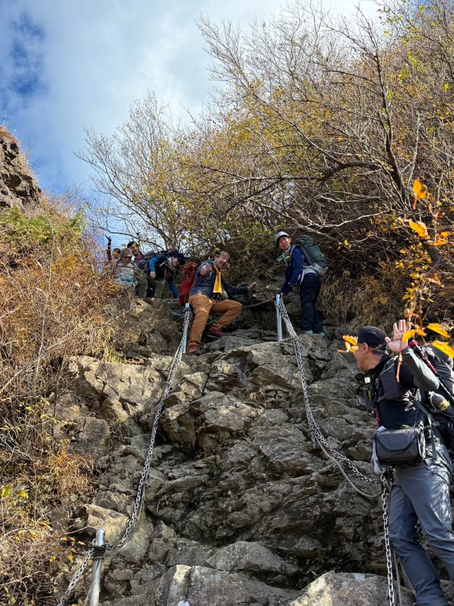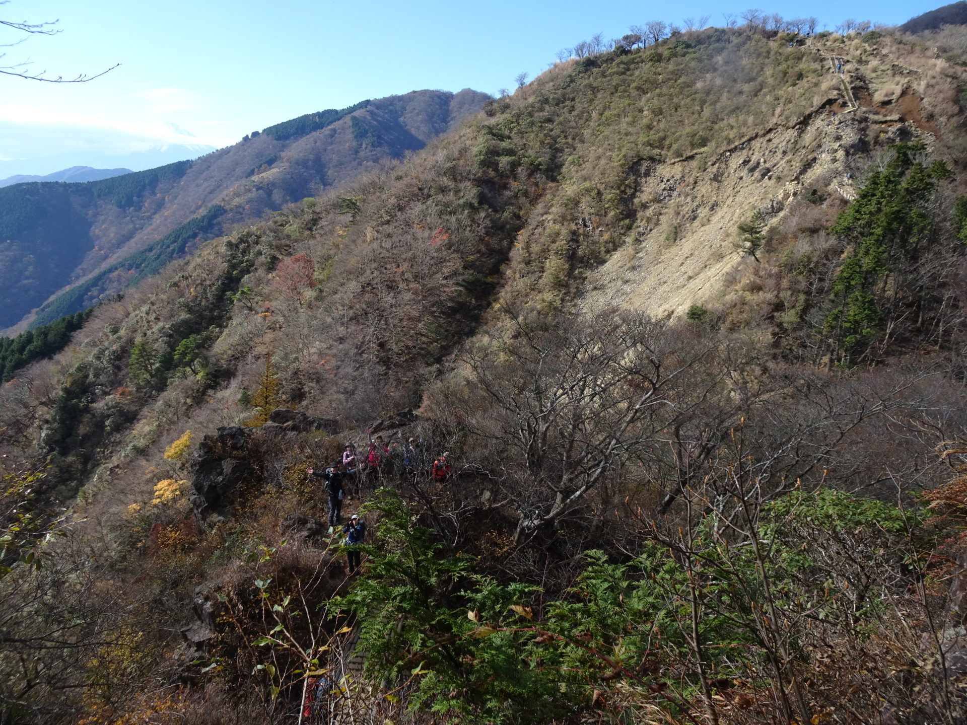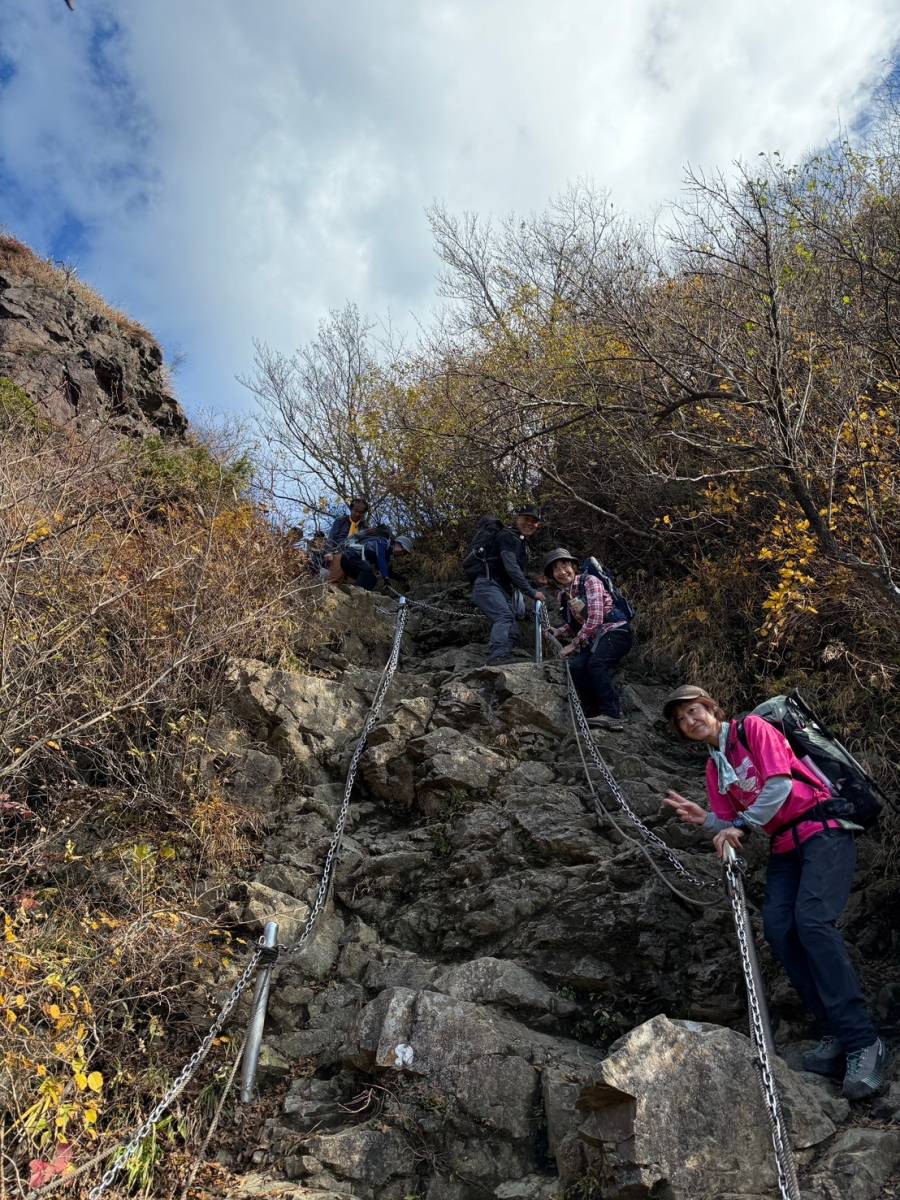 展望のよい尾根道を気持ち良く歩き、11時19分、鳥尾山に到着、昼食をとる。ここまでは順調だったのだが、行者ケ岳を過ぎてから登山者の列が止まる。多くの慣れない登山者(ツアー客?)で、鎖場で渋滞になっていたためで、通過に小1時間かかる。予報に反し比較的暖かかったから良かったが、荒天だったら身体が冷え切るところだった。