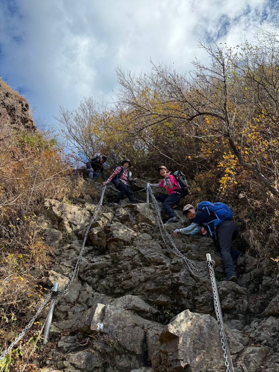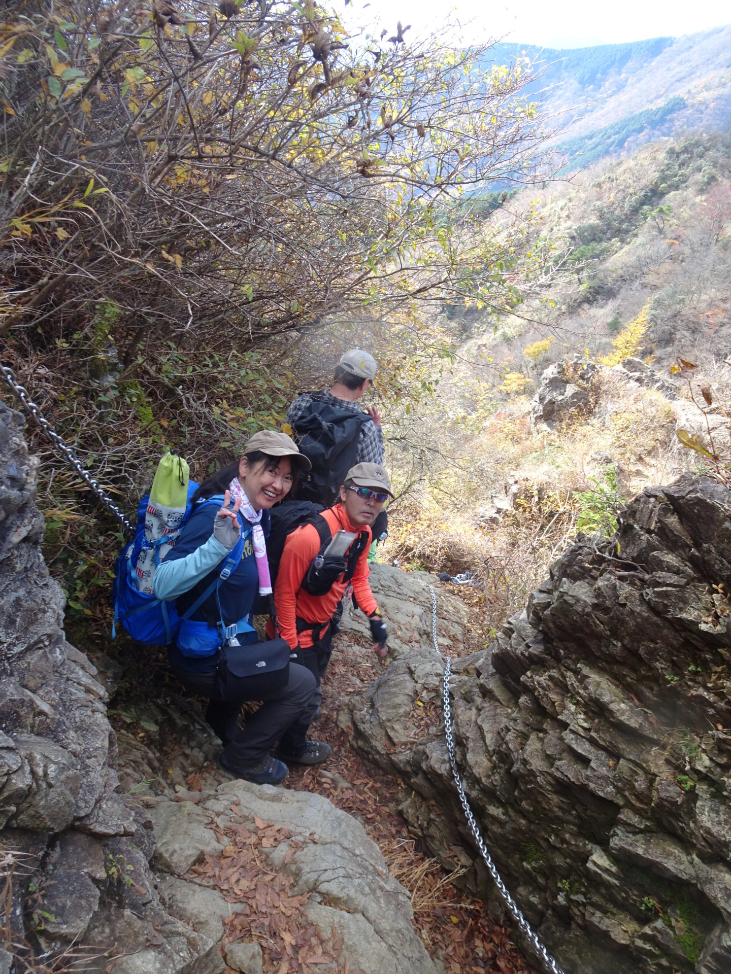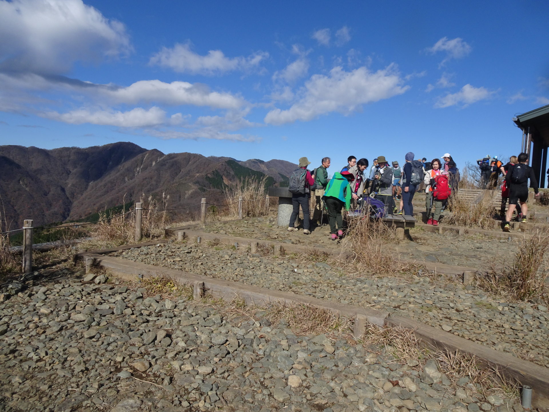展望のよい尾根道を気持ち良く歩き、11時19分、鳥尾山に到着、昼食をとる。ここまでは順調だったのだが、行者ケ岳を過ぎてから登山者の列が止まる。多くの慣れない登山者(ツアー客?)で、鎖場で渋滞になっていたためで、通過に小1時間かかる。予報に反し比較的暖かかったから良かったが、荒天だったら身体が冷え切るところだった。