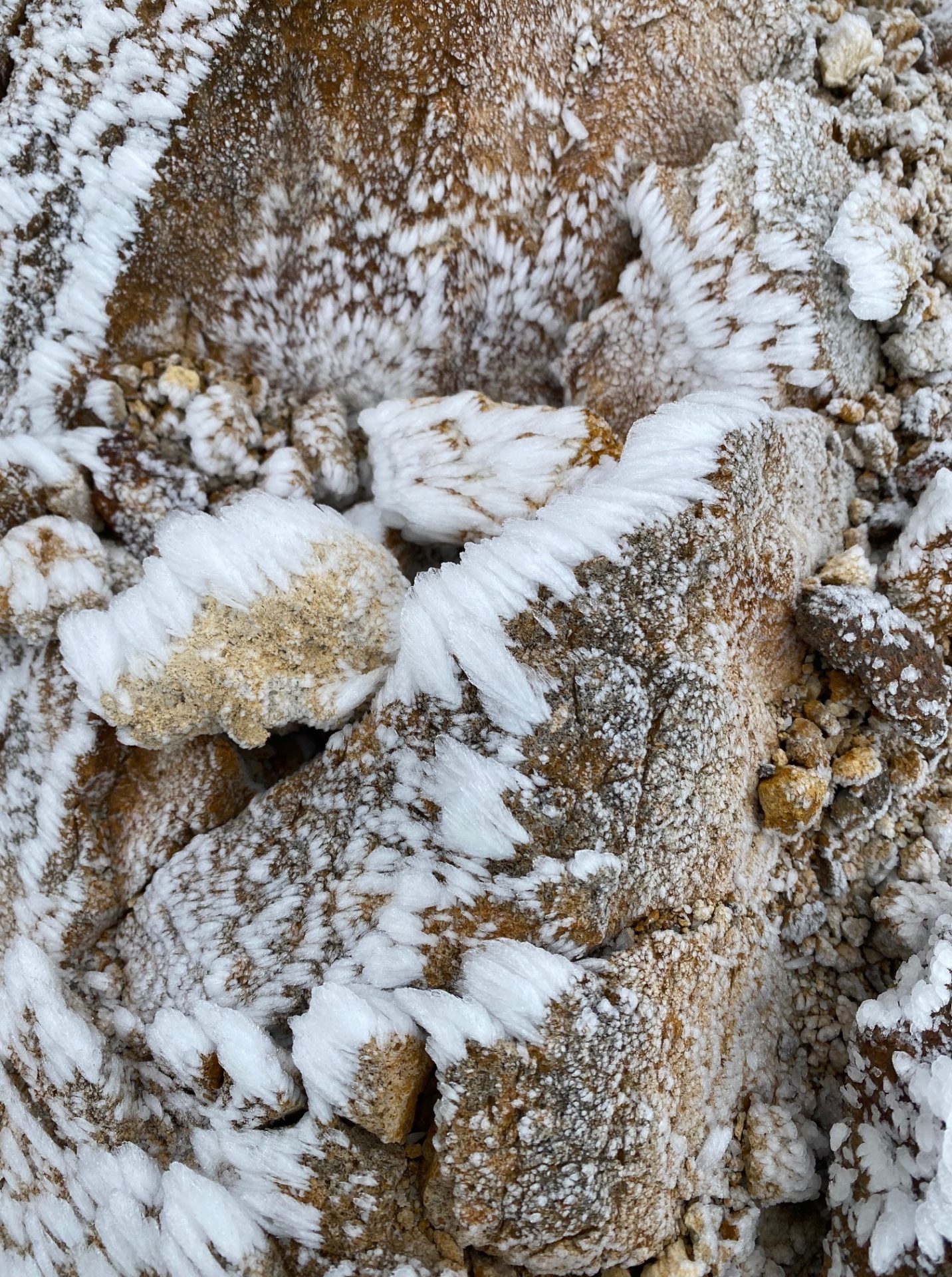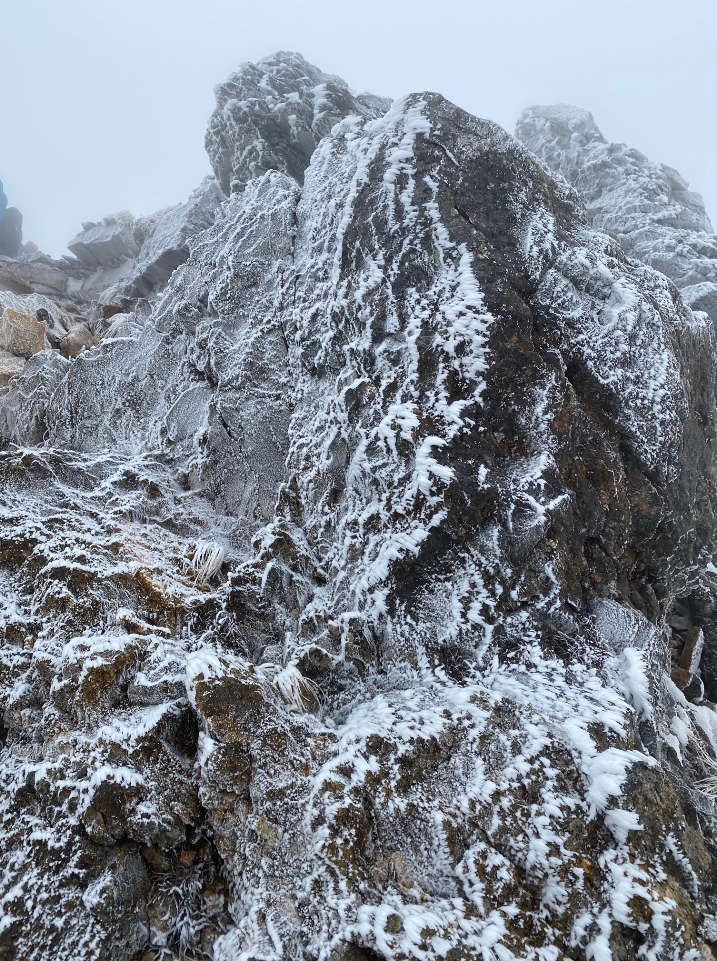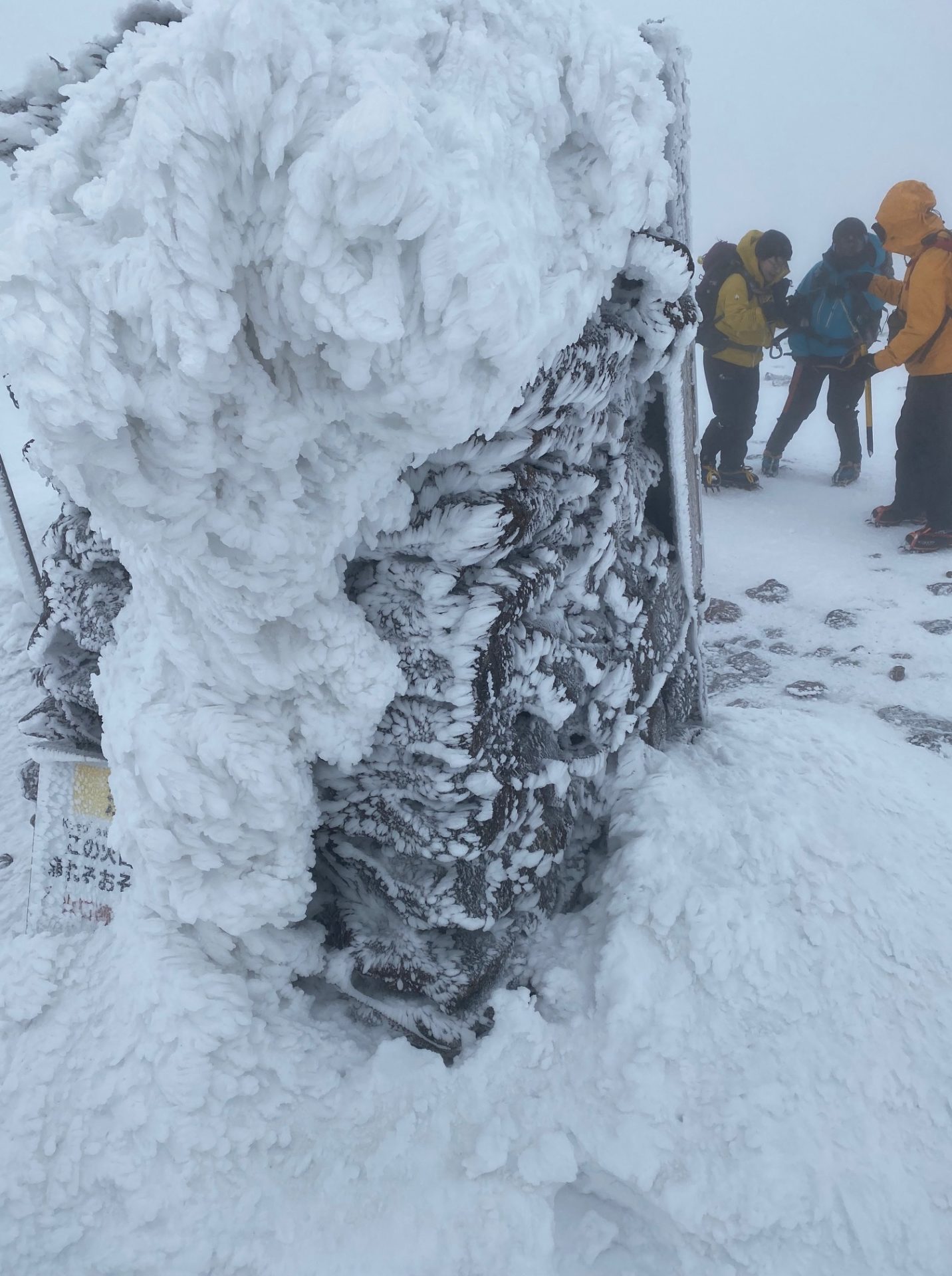 岩やハイマツ、道標に付いた霧氷が同じ方向に伸びて「エビの尻尾」になっている。