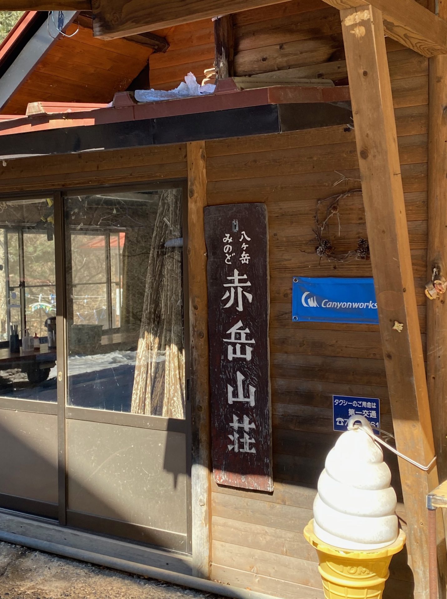 高気圧に覆われ概ね晴れとの予報の中、9:10茅野駅集合、バスで美濃戸口まで行く。車内から見る八ヶ岳の色は「黒い」。日差しは強く、気温も高い。目的は「積雪期の歩行強化」で不安が・・・。美濃戸口を予定より10分早く出発する。10分ほど歩いたところでチェーンスパイク(軽アイゼン)を装着。車で固められたアイスバーンもこれなら安心だ。11:40赤岳山荘にて休憩。目の前には、八ヶ岳ブルーを背に赤岳がそびえ立っている。堰堤の手前で一休み。堰堤を越えて、やっと山道に入る。