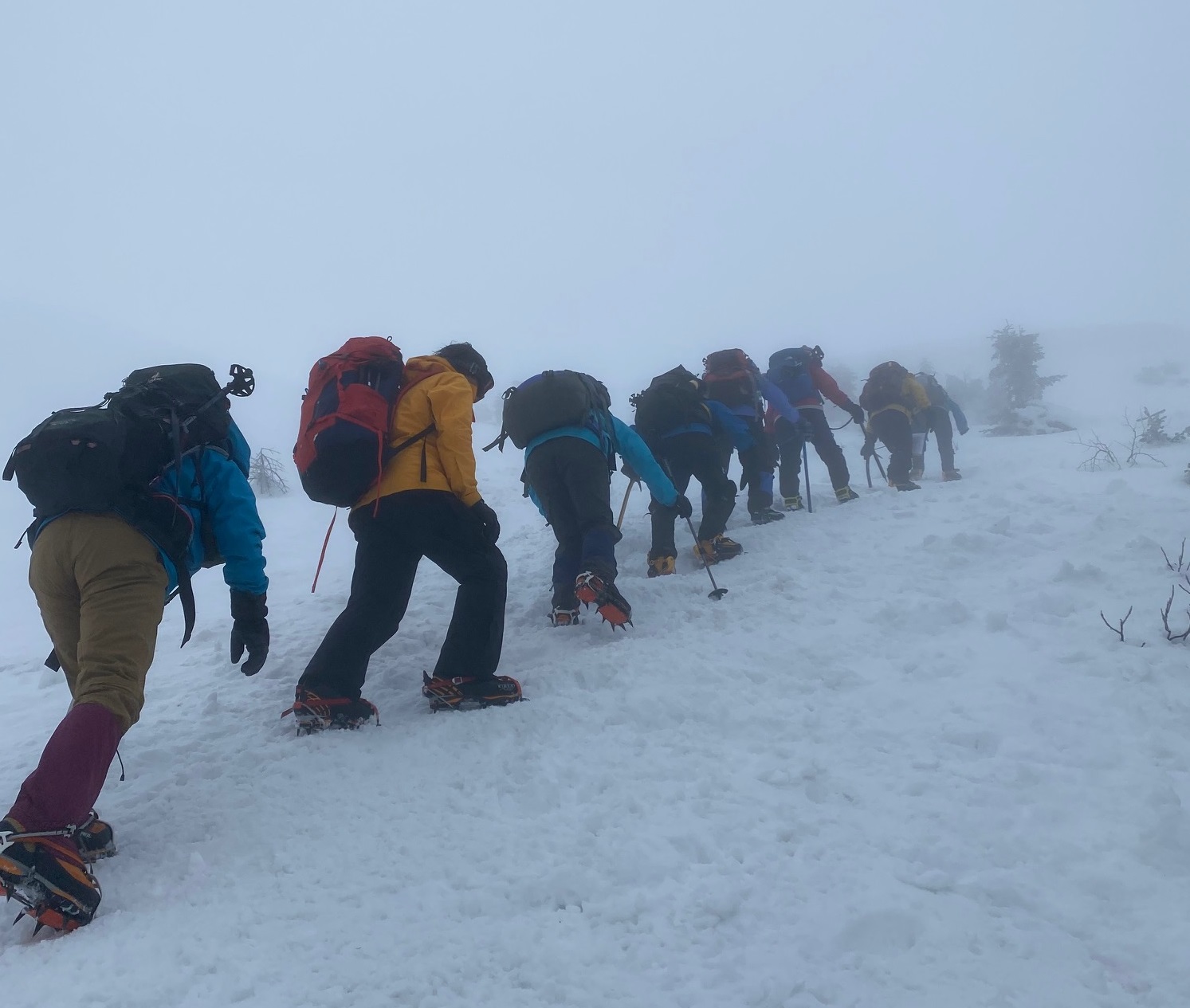 6時30分朝食。アイゼンを装着し準備を整え、7時30分前に出発。どんよりした曇り空。歩き始めは樹林の中で風もなく、空気はあたたかい。1時間半ほど歩いて樹林帯を抜けると風が吹き付け、雪の急登になる。足元に神経を使い、足先を雪に食い込ませるようにして登る。先頭の何名かは、数メートル離れた人が滑落して四つん這いになっている姿を見たという。