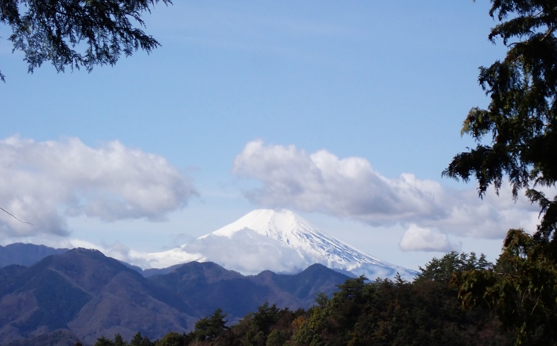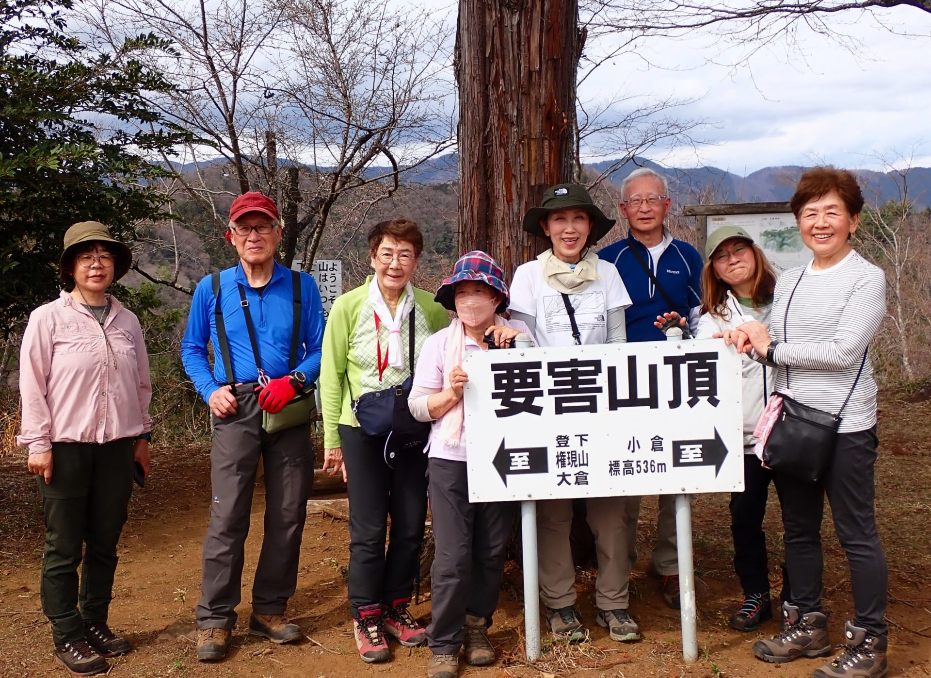 【記録】昨年6月の山行で企画してから3回続けて雨のため中止になった要害山山行は、4度目の正直でついに実現した。前夜の雨は登山口ではすっかり晴れて、暑くなりそう。歩きやすいが急な山道をゆっくり登る。1時間登り続けると最初のピーク尾続(おづく)山山頂に出た。正面に雪を被った美しい富士山が大きく見えて、みんな、わぁーと声をあげる。ここからは尾根道を上り下りして縦走路の中で最高点の実成(みなし)山からコヤシロ山へ。樹木が伐られていて、ここからも富士山が展望できる。昼食後、要害山に向かって歩き出す。やせ尾根の急坂を、張られたロープを使って、下りまた上る。風の神様という小さなピークに立って、やがて、要害山の頂上に着く。かつての山城には小さな花をたくさんつけた桜の木が数本。小倉の集落を抜けて鏡渡橋に下った。(文・写真/石塚嘉一)