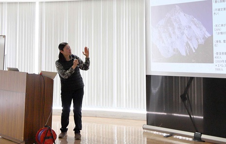 10時から武蔵境の武蔵野スイングホール・スカイルームで開催された。会場一杯の92名の聴衆が小松氏の身振り手振り豊かな熱のこもった講演に聴き入った。小松氏は秋田県出身の登山家・写真家で、高校1年生の時、大平山に登頂し、町を見下ろす景色に感銘を受けて登山を始めた。ヒマラヤを夢見て東海大学登山部に進み、厳しい訓練の中で環境を切り拓く力を養った。