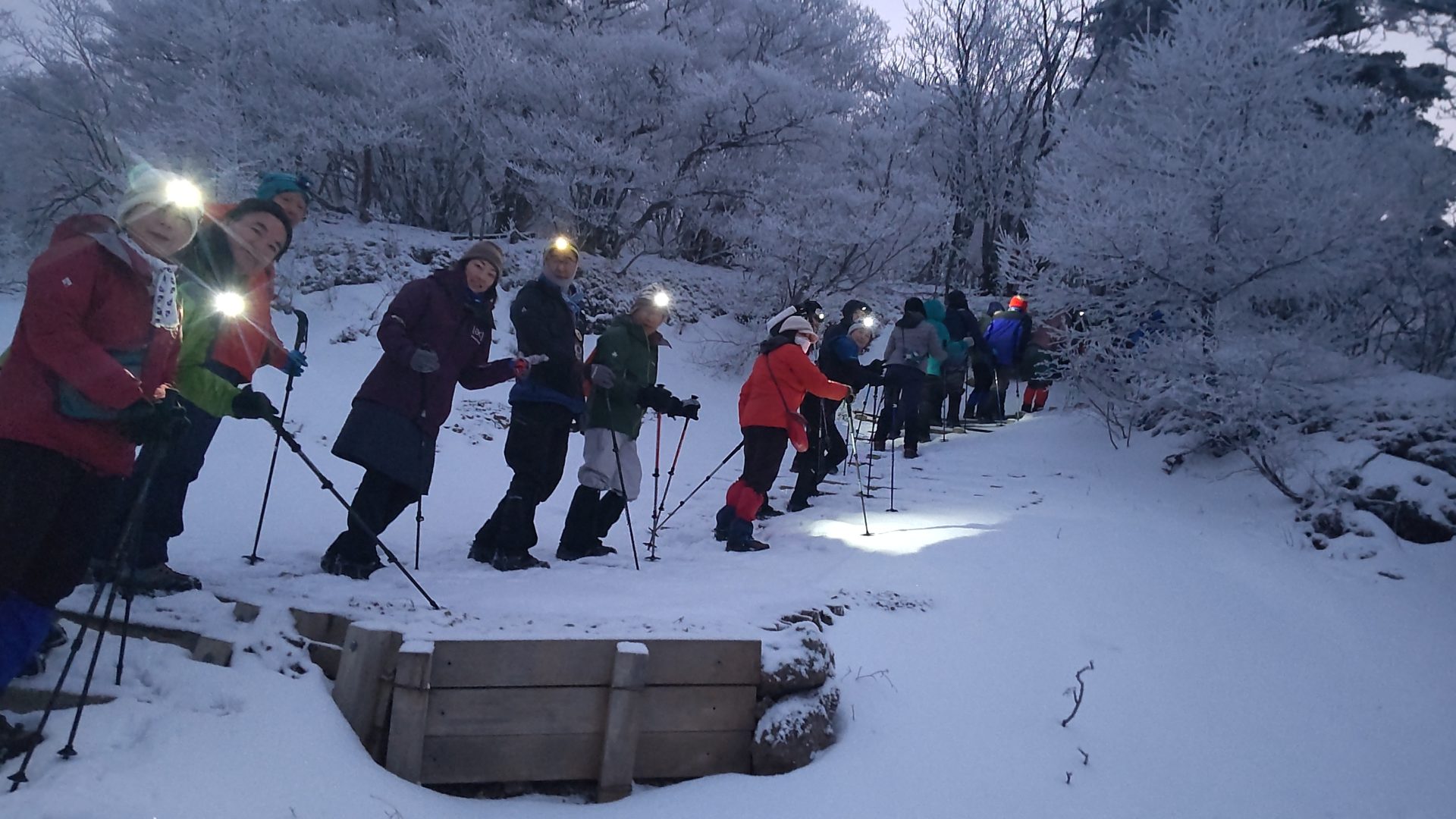 修了式では、支部長から一人一人に修了証が渡された。修了式後に聞いた印象深かった山行には、長時間歩行した川苔山や、雪山体験をした入笠山、そして降雪の修了山行の三ツ峠山をあげた人が多かった。今年の三ツ峠山は降雪があり、長時間アイゼン歩行ができ、霧氷の美しさや雪山の厳しさに魅了されたようだっ