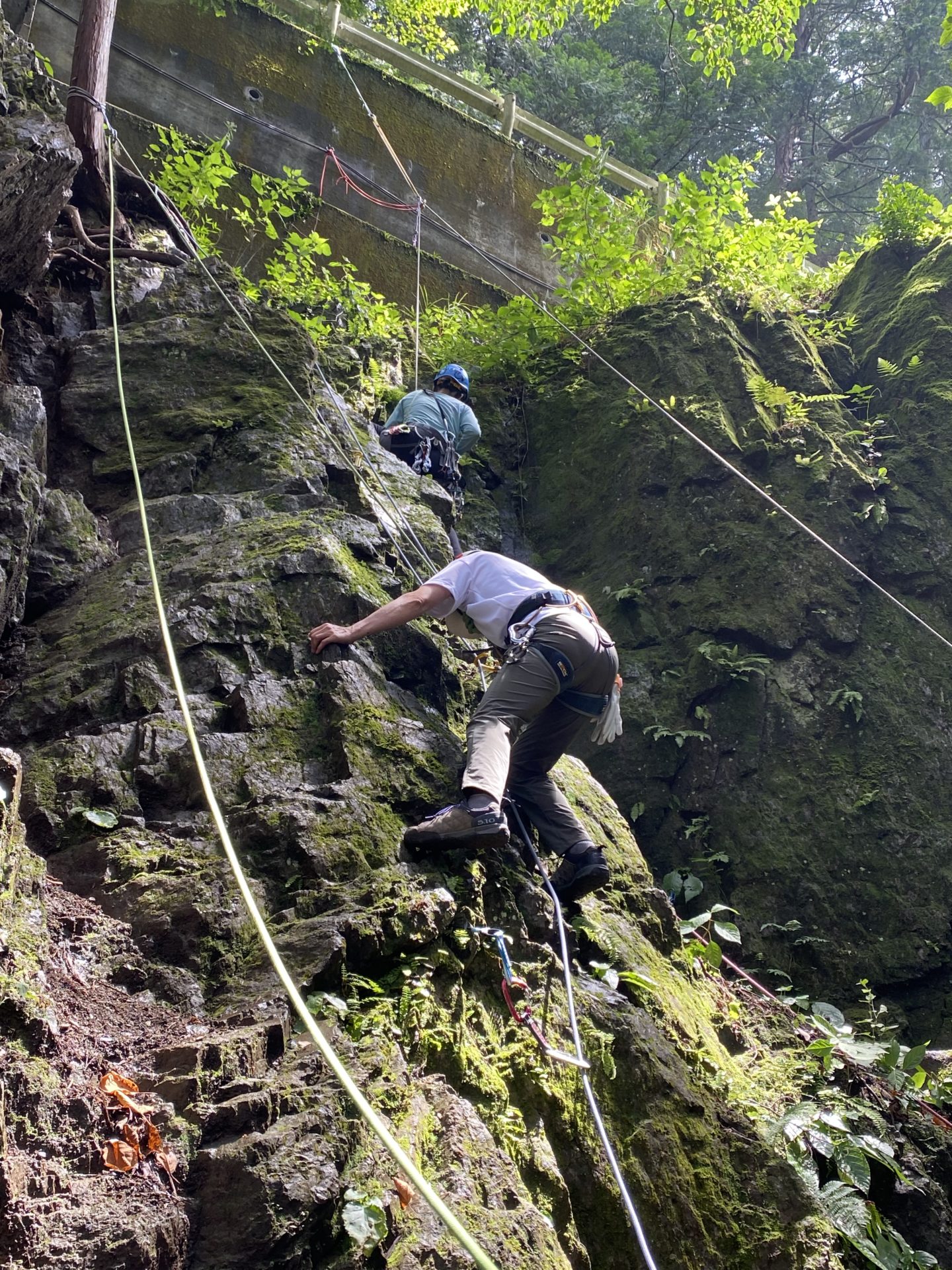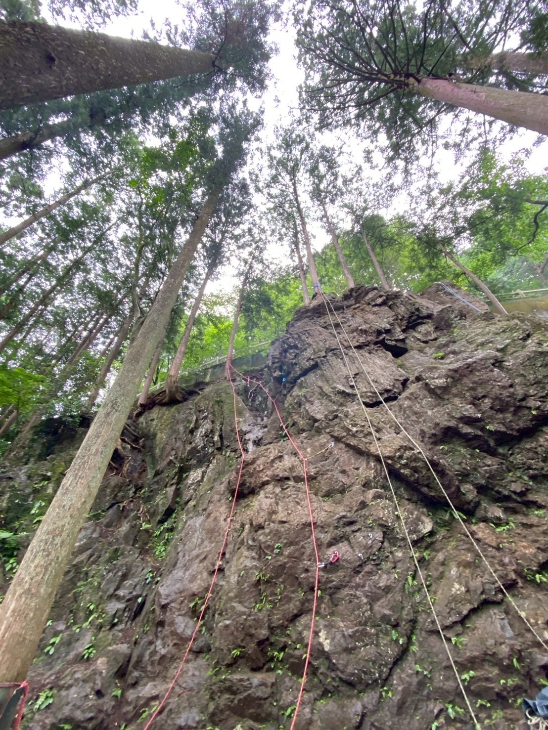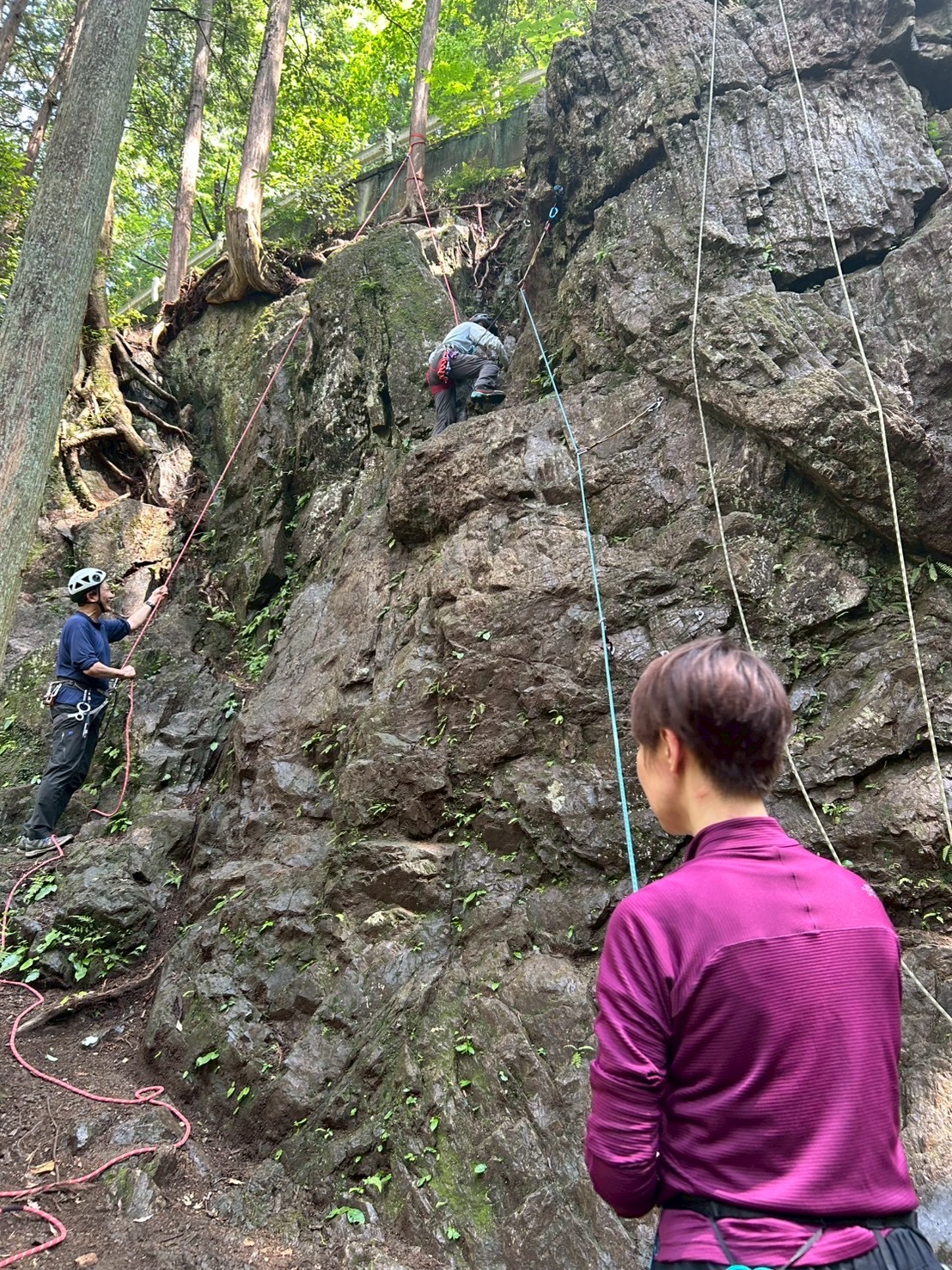 【講習】東吾野の平戸の岩場にて講習会を実施した。9時20分、東吾野駅集合。8分程度歩いて現地に到着すると、すでに河地講師によって、岩場に4か所トップロープが設置してあった。好奇心と緊張感が漂う中、すぐさま河地講師のお話に惹きつけられる。道具の説明から、ロープの結束、ビレイ(確保)の方法等について説明後、トップロープでの登下降が始まる。受講生3人が一組となり、クライマー、ビレイヤー、タイム計測の役割を繰り返し体験。河地氏によると、クライミングに一番大事なことは「考える」こと、行き当たりばったりは駄目、登る前によく見てあらかじめルートを構築、足の置き場、落ちたらどう振られるかなど考えながら、常に危険を念頭にとのこと。