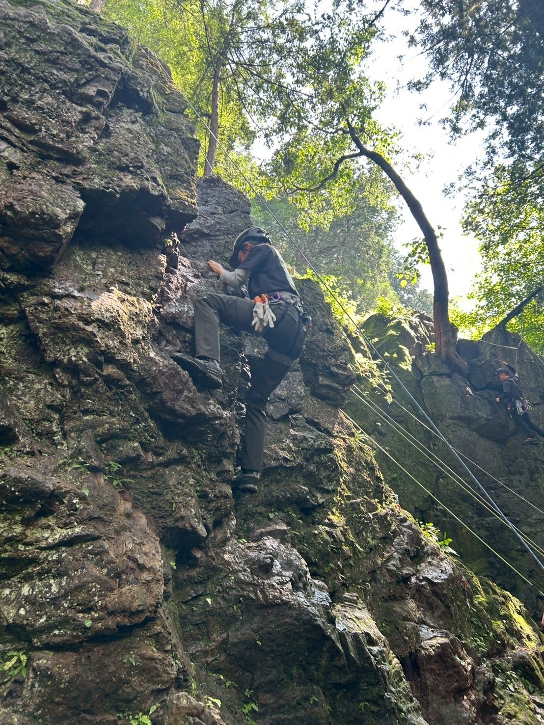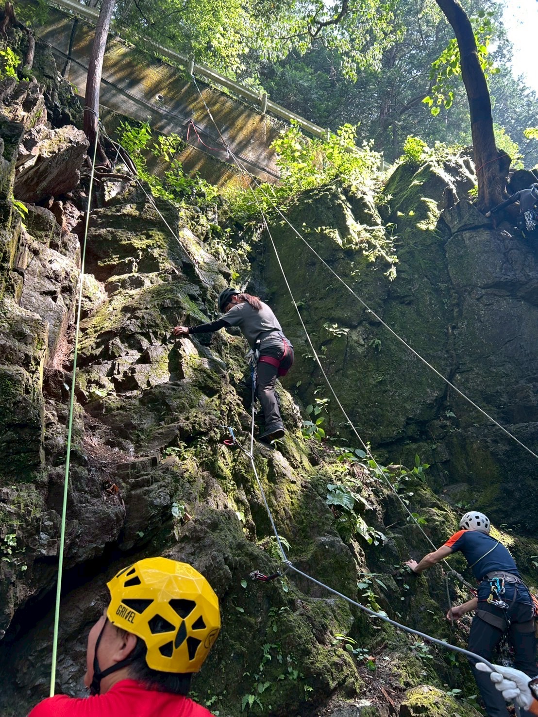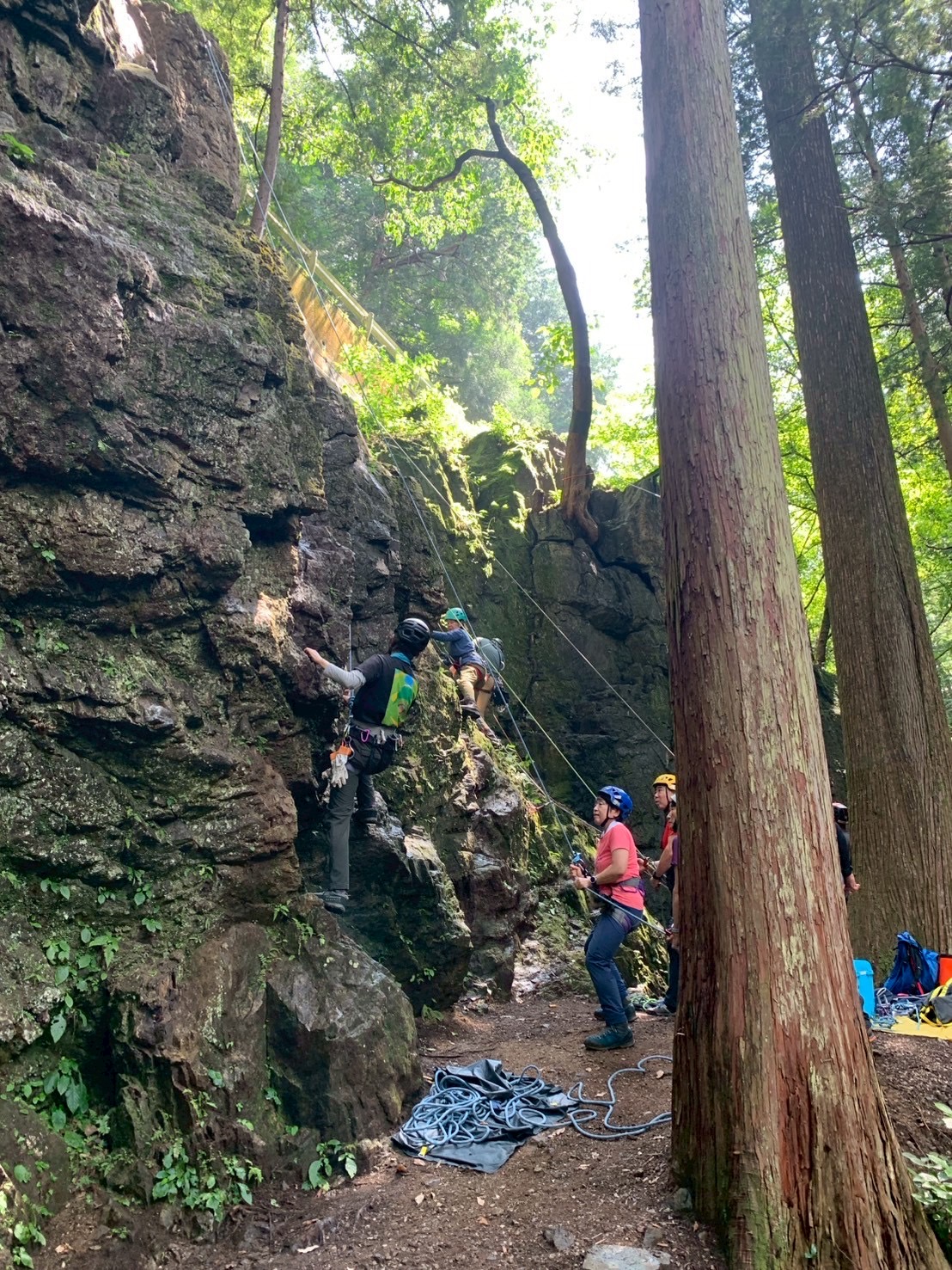 【講習】東吾野の平戸の岩場にて講習会を実施した。9時20分、東吾野駅集合。8分程度歩いて現地に到着すると、すでに河地講師によって、岩場に4か所トップロープが設置してあった。好奇心と緊張感が漂う中、すぐさま河地講師のお話に惹きつけられる。道具の説明から、ロープの結束、ビレイ(確保)の方法等について説明後、トップロープでの登下降が始まる。受講生3人が一組となり、クライマー、ビレイヤー、タイム計測の役割を繰り返し体験。河地氏によると、クライミングに一番大事なことは「考える」こと、行き当たりばったりは駄目、登る前によく見てあらかじめルートを構築、足の置き場、落ちたらどう振られるかなど考えながら、常に危険を念頭にとのこと。