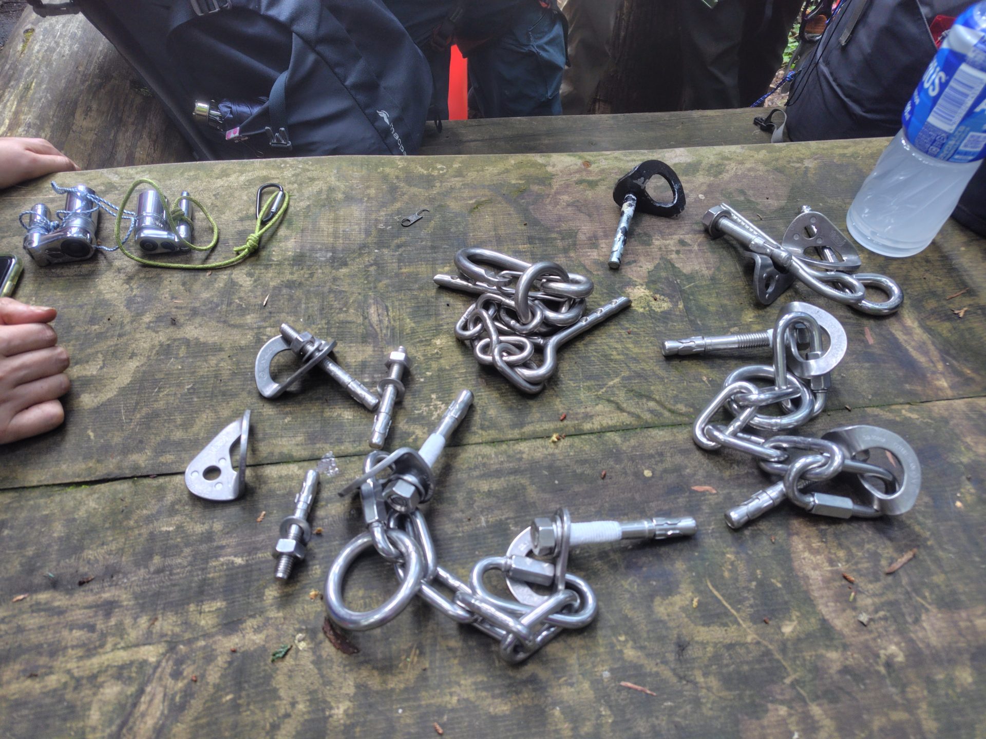 一通り終わって、カム、クイックドロー、ロープを回収後、岩に埋め込む支点の設置法の紹介があった。形状や素材の違う様々なアンカーボルトを前に説明する河地講師の声も弾む。石を使ってボルトを打ち込む作業を実地体験。