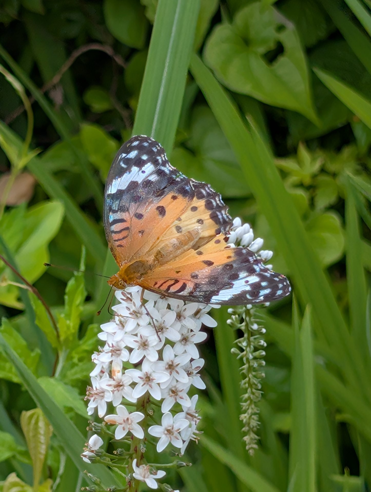10時半過ぎに陣馬山の頂上につき、お腹がすいていたのでお弁当を半分食べた。その時、キアゲハとツマグロヒョウモン、黒いアゲハ、小さいシジミチョチョウがひらひら飛んできて、また周辺の満開のトラノオの花で吸蜜していて、吸蜜に夢中で全然動かない。シャッターチャンスに撮影会が始まった。そんなわけで、頂上に50分ほどいた。