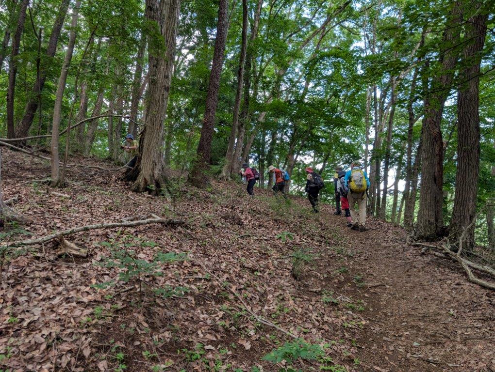 2025年6月27日(金)に今年前半の最後の「低山を楽しむ会」を実施し、陣馬山へ向かった。いつもの石塚嘉一リーダーは別件で忙しく、総合リーダーに河野悠二、先頭を歩くリーダーに小部正治、サブリーダーに横関邦子と3人がかりで代行した。集合はJR 藤野駅8時で少し早めだが、和田まで行くバスの本数は少なく8時10分のバスに乗りたい。いくらか曇りであったが、数日前から急に気温が高くなり、熱中症の心配もした。和田でバスを降り、和田尾根コースの登り口まで舗装道路を20分ほど歩いた。登り口に入ると高い樹林の中で、思ったより気温は高くなく、涼しい風も吹いてきて快適だった。体を慣らしながら30分ごとに水休憩を取り、鳥の声を聴きながらゆっくりと歩いた。1時間半ほど歩くと一ノ尾根に合流し、引き続き木の下をのんびり歩く。