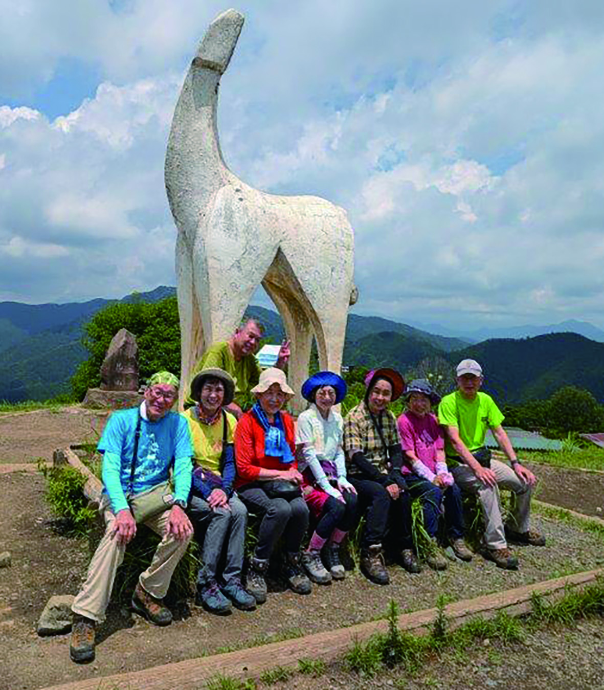 頂上にあった雲がなくなり、暑くなってきたのでリーダーの掛け声で下山開始。30分ごとに休憩し、ゆっくり下山。途中「テラス」と呼ばれるベンチとテーブルが置かれた休憩所があり、残りの昼食を食べ、緩やかに続く下りの尾根コースを下山した。涼しい風も吹いてきてその風が気持ち良い。「ああいい風!」と山を歩いた人のみ感じる爽快さをところどころで味わった。陣馬山登山口までのは少し長いが、「低山を楽しむ会」にはぴったりの樹林の中の道だ。帰りのバスの時間に20分の余裕をもって全員無事到着した。