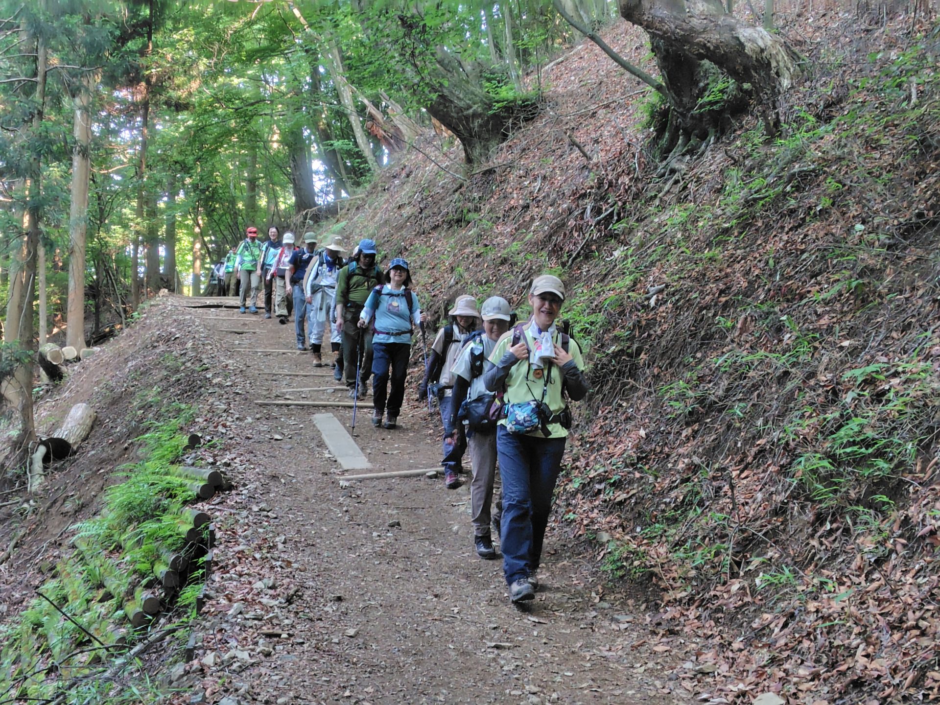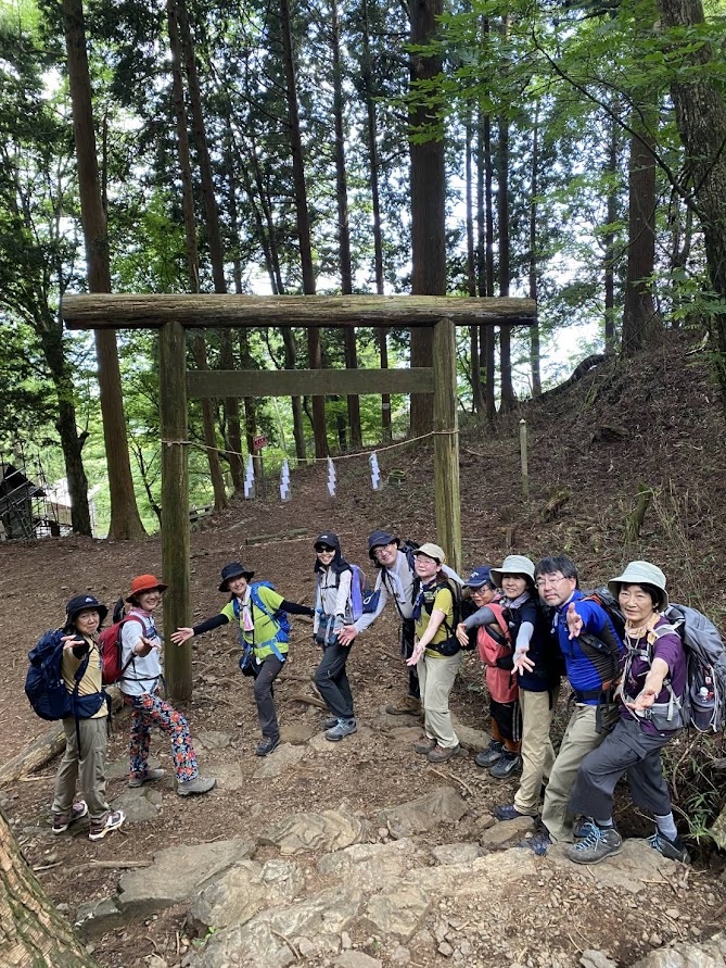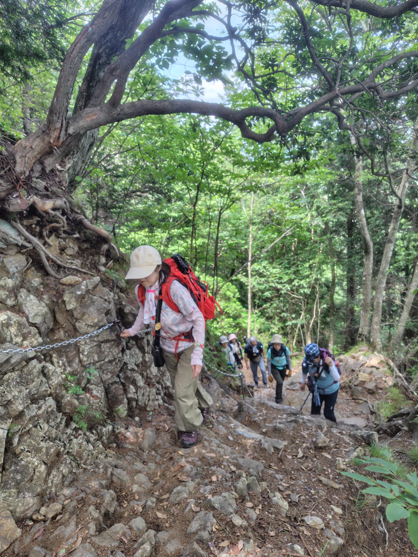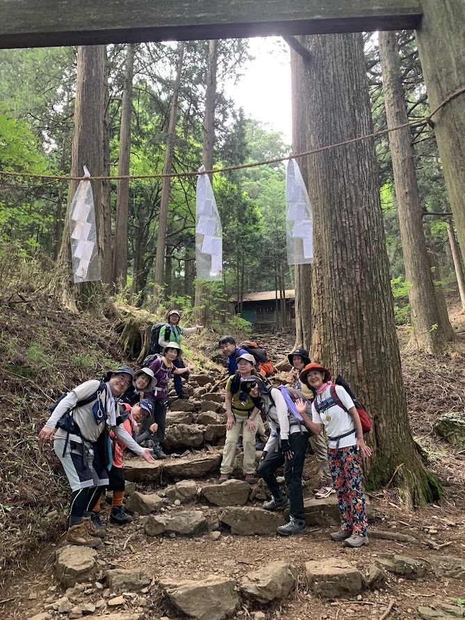 【報 告】御嶽駅で他団体の参加者を同姓だったため受付集金してしまうハプニング。バス、ケーブルカーを乗り継いで820mの御岳平へ。全体ミーティングと体操の後、班ごとに分かれて出発の準備。今回の登山は、岩場の登降に重点をおきつつ、初夏の登山の体験というところ。C班を先頭に歩きだす。チップの遊歩道からビジターセンター、御師集落を抜けて、鳥居前広場の日陰で休憩。長尾平分岐を過ぎて奥の院分岐までワンピッチ。分岐からはゆるゆると下る。樹林帯の中、沢音と吹く風と明るい緑に涼む。綾広の滝付近の水場では誰もが手を伸ばし、流れる水に触れている。急斜面にジグザグに切ってある登山道を汗をかきながら登ると芥場峠だ。この後岩場まじりの登山道で前からも後ろからも登山者がやってくる。受講生らは、岩場を難なく通過し大岳山荘跡の広場へ到着。