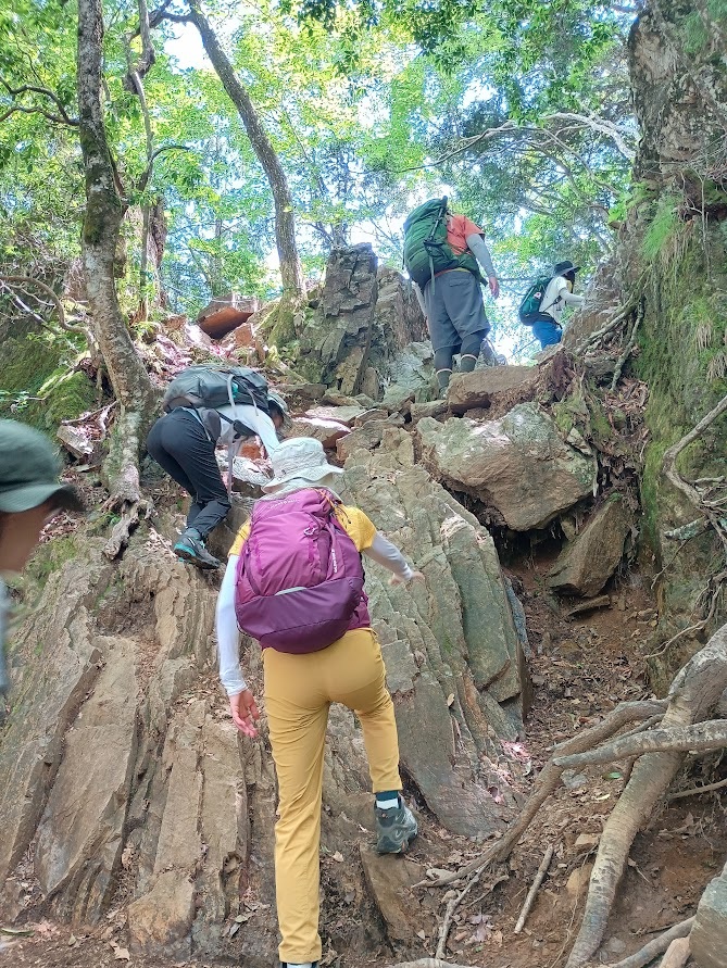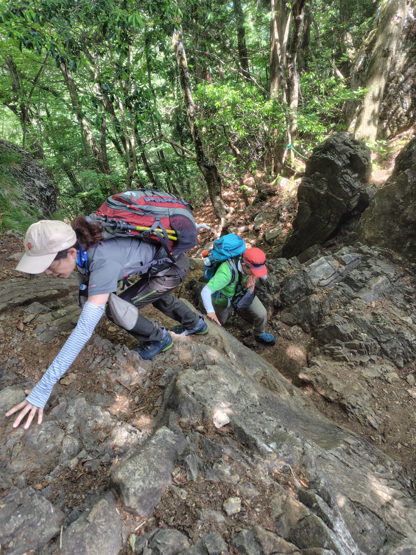 昼食のあと小さな岩でスタッフによる三点確保のデモンストレーション、山頂直下の岩場通過に備える。大嶽神社から山頂までの120mのワンピッチはトランシーバによる後続への連絡をやめて、とにかく班単体で通過することにした。途中野口支部長は三点確保が必要な箇所にとどまり、受講生の登る様子を見てアドバイス。