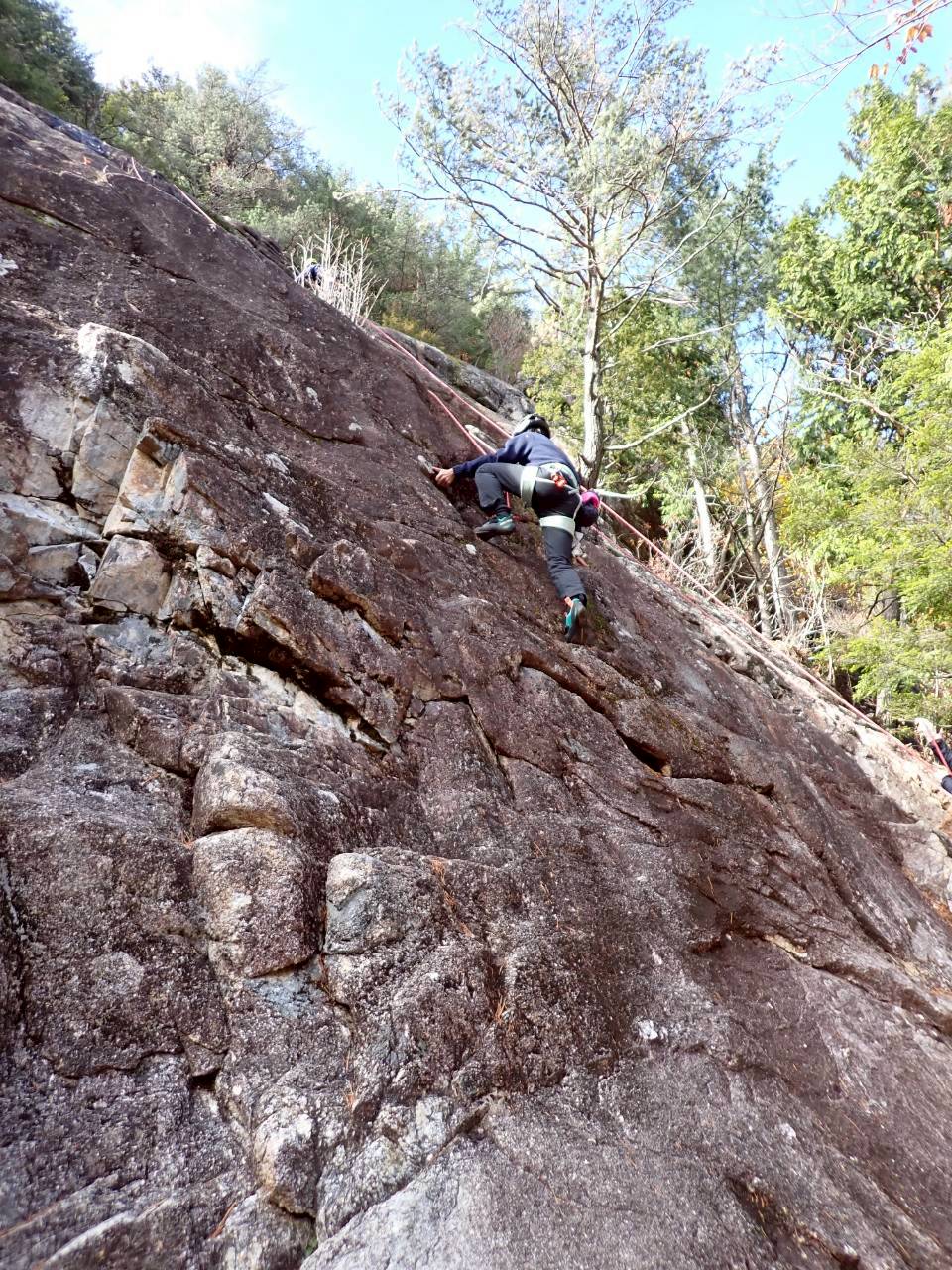 前日までの降雨により、朝からの開始予定が午後開始に変更されたが、ガマスラブにてクライミング講習が行われた。講師はガイドの保科氏、松原氏、谷氏、杉原氏の4名で、多摩支部からは9名(今中、内田(光)、金坂、要、木谷、五島、藤原、古谷、山本)が参加。岩場でのクライミングが初めての参加者も、ジムとは異なる岩場での緊張感を感じながら、講師陣からの丁寧かつ適確な指導、助言のもと、課題に挑戦した。