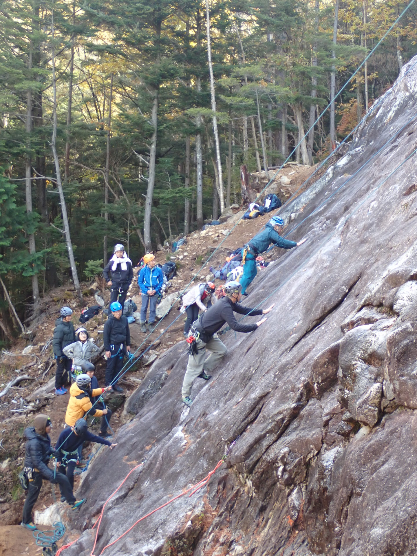 2日目は朝から快晴。講習班へは多摩支部からは11名(今中、内田(光)、金坂、要、木谷、五島、田邊、中島、藤原、古谷、山本)が参加し、午前8時に集合してキャンプ場から少し離れた岩場に移動、午後4時までトップロープでの登攀練習を行った。2日目の講習では、クラック、チムニーの登り方等の講習もあり、夕方キャンプ場に戻ってきたメンバーの中には指や手に傷を作っている人も多かったものの皆満面の笑顔で、講習が充実した内容だったことが伝わってきた。