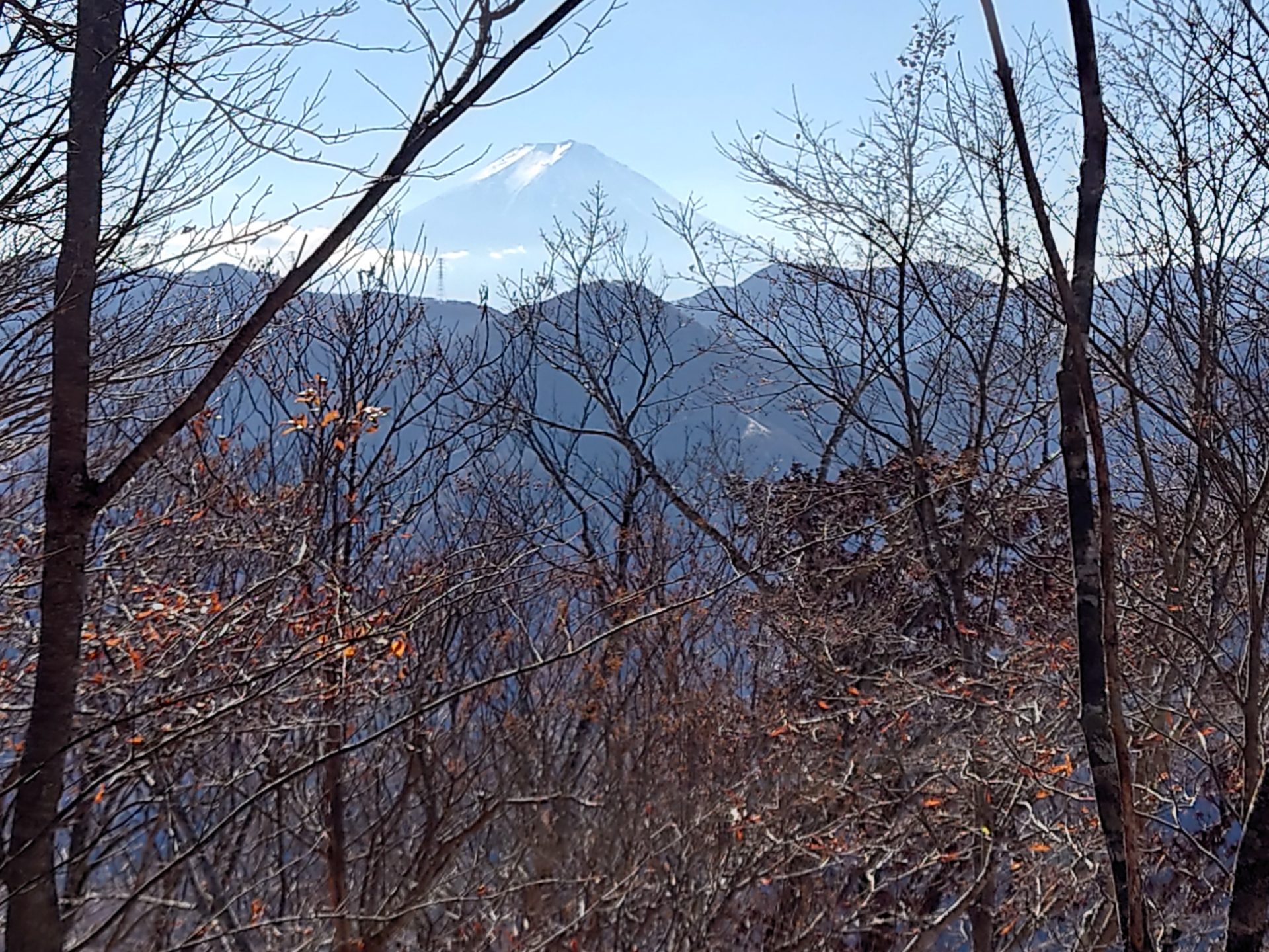 ■思った以上の急登、零下の冷たい風に耐えてたどり着いた山頂からは、見事な富士山やぐるりの山々そしてビル群と、ご褒美の景色。下りではリニア新幹線の走行試験音も聞こえて見てもいないのに得した気分。風を避けて休憩し、陽だまりにホッとする冬ならではの山行を楽しみました。(土橋)