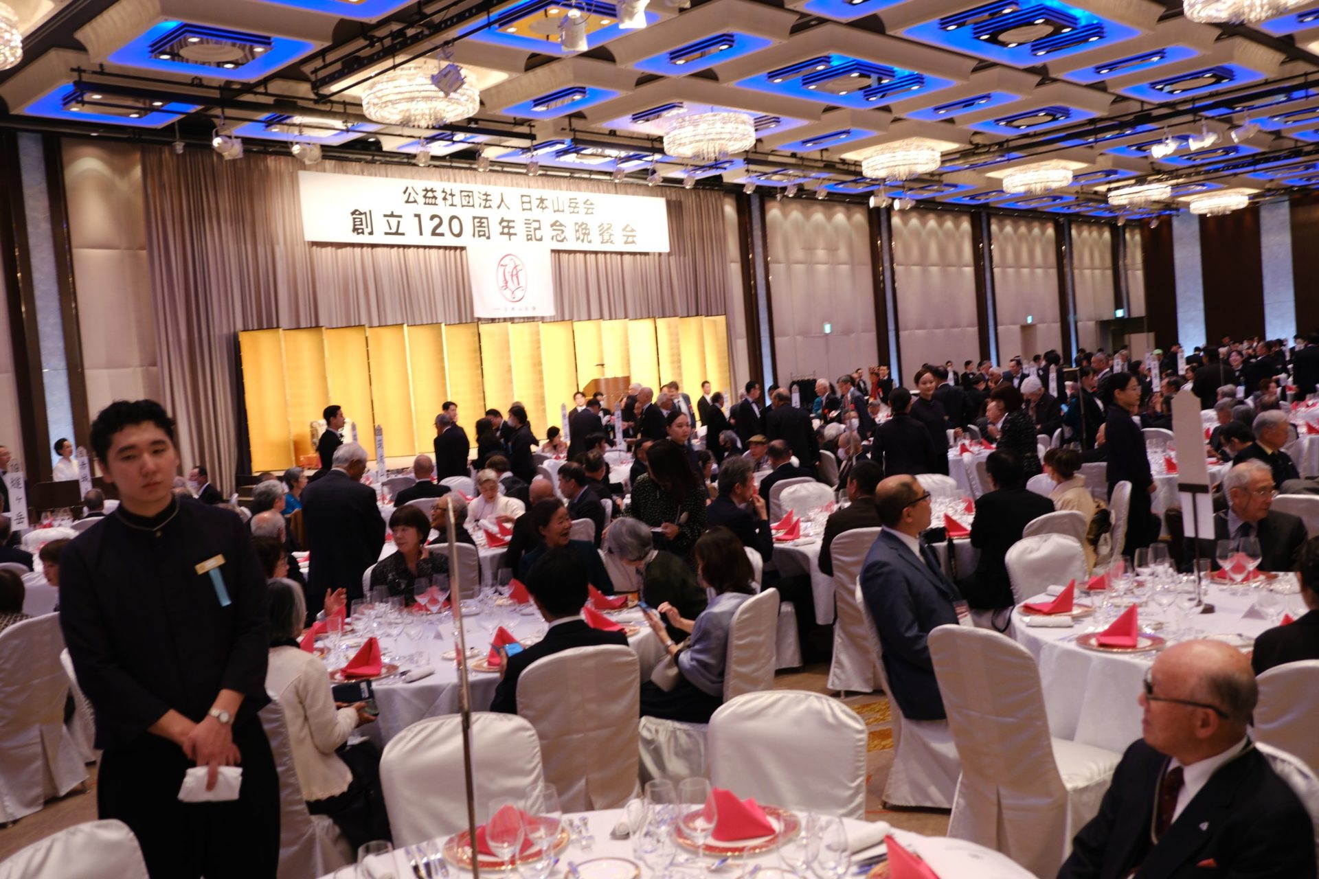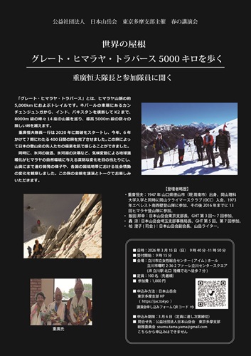 2026年12月6日、京王プラザホテルの5階コンコードボールルームにて日本山岳会年次晩餐会が開催された。天皇陛下が120周年記念式典に続いて晩餐会にもご臨席された。120周年ということから国内外から多くのご来賓が参加され盛大な催しとなった。出席者は例年より200名ほど多く約550名で、多摩支部から47名が参加した。テーブル数は71と、ホールいっぱいに配置され壮観だったが、陛下は、はるかかなたから入退場され、ほとんど拝することができなかったことが残念だった。橋本しをり会長が、「国際的な交流がJACの財産であること、歴代会員の築いてきた歴史を受け継ぎ、本日の集いがさらなる発展へつながってほしい」と挨拶した。続いて女性のジュリアン・ロングボトム駐日英国大使が英語と日本語で、昨年、天皇ご夫妻が訪英されたことに触れ、「ウェストン氏がその功績によって日本近代登山の父とされ、各地で氏をたたえるイベントが開催されており、両国の深い友情の基になっている。今後の両国の協力が深まることを期待する」と挨拶をされた。鏡開きに引き続き、同じく女性のカナダ山岳会のイザベル・デニョ会長が「カナダ山岳会とJACは同じスピリットをシェアしており、相互の友情を高めていきたい」と、挨拶され、「カンパイ!」と、音頭をとられた。その後、各テーブルで交歓が行われた。歓談中に、江戸獅子舞と、司会のバレンタインまさ子会員による日本舞踊が披露された。全国の支部の紹介後、新たに誕生し、今回の晩餐会を担当した東京支部の会員による三本締めで中締めとなった。例年と異なって華やかな雰囲気がする晩餐会だった。