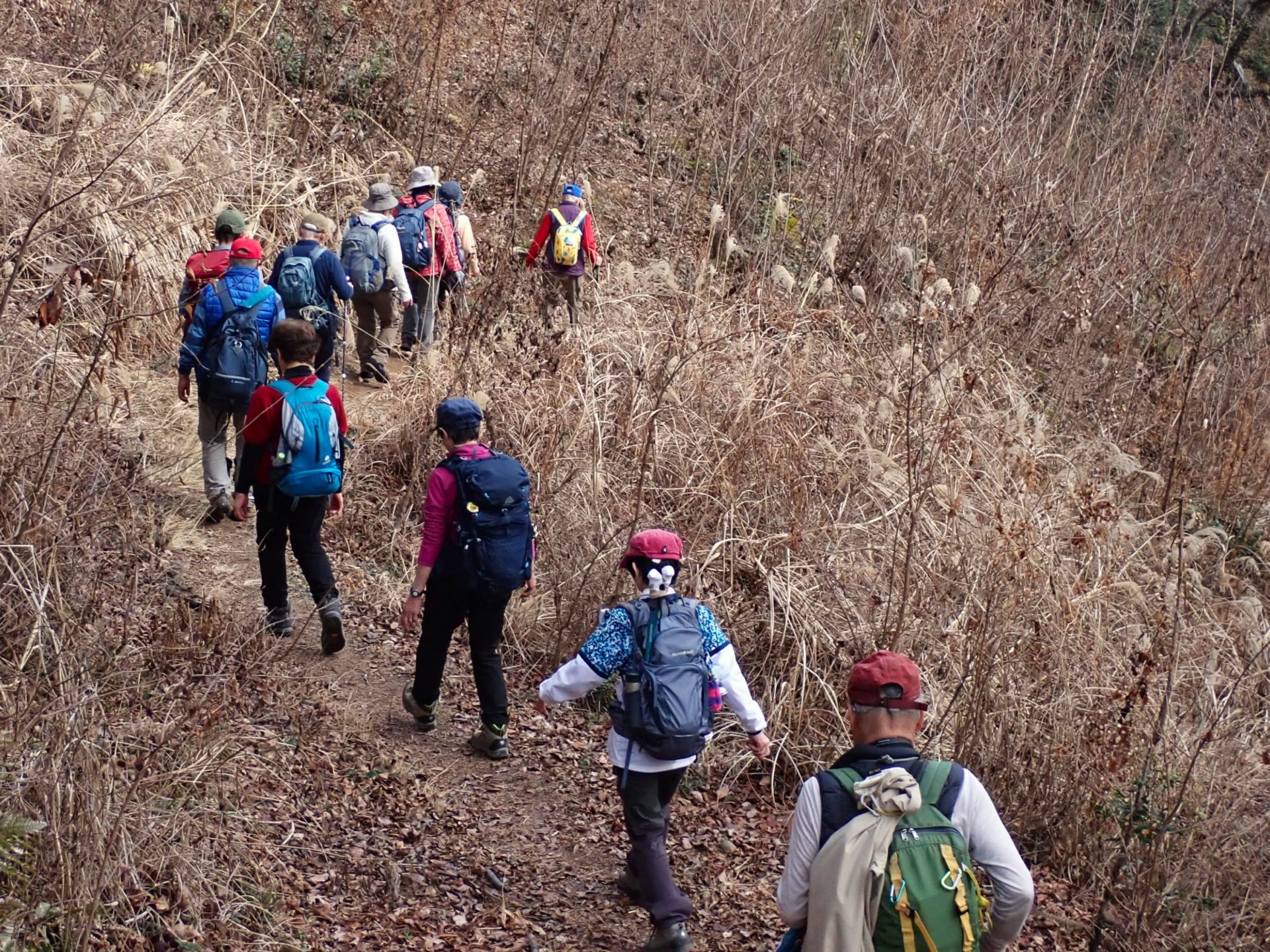 昼食後、東光院、妙見宮を通って再び山道に入り、この日の最高地点、猿取山(285m)に着いた。午前中に登った菅生峠から数分のところだ。さらに数分で、御岳山、大岳山、馬頭刈山などが並んで見える展望ポイントに出て、しばし休憩。そこから宮本古道という主に広葉樹の自然林がきれいな尾根道を行き、途中から東光院横に下って、帰途についた。なお、「ひので野鳥の森自然公園」とのことで、下見のときは、アオゲラの声を直ぐ近くで聞いたので、多くの野鳥に出会えるのかと期待していたが、今回はこれという鳥には会えなかった。(文・写真/石塚)