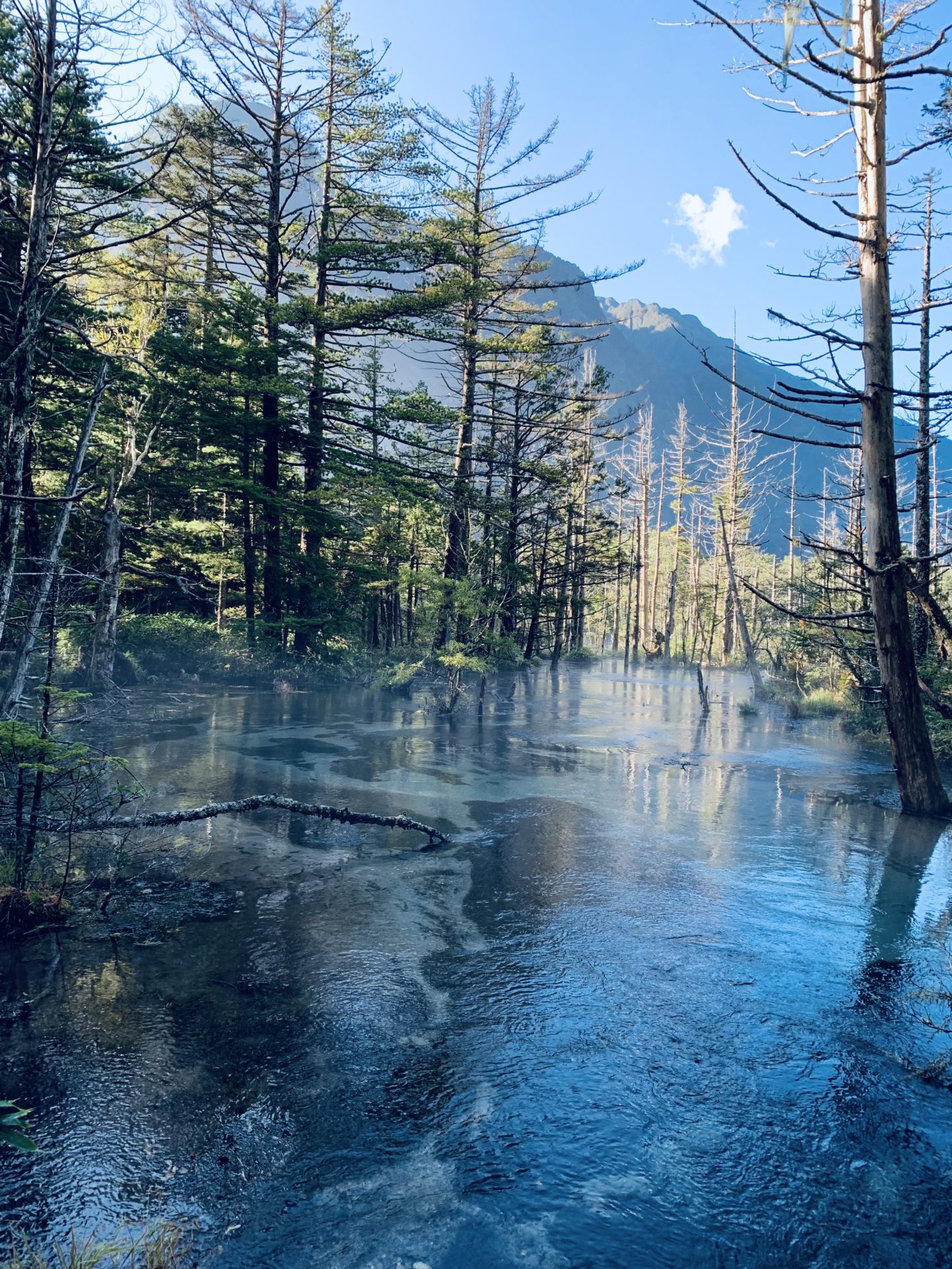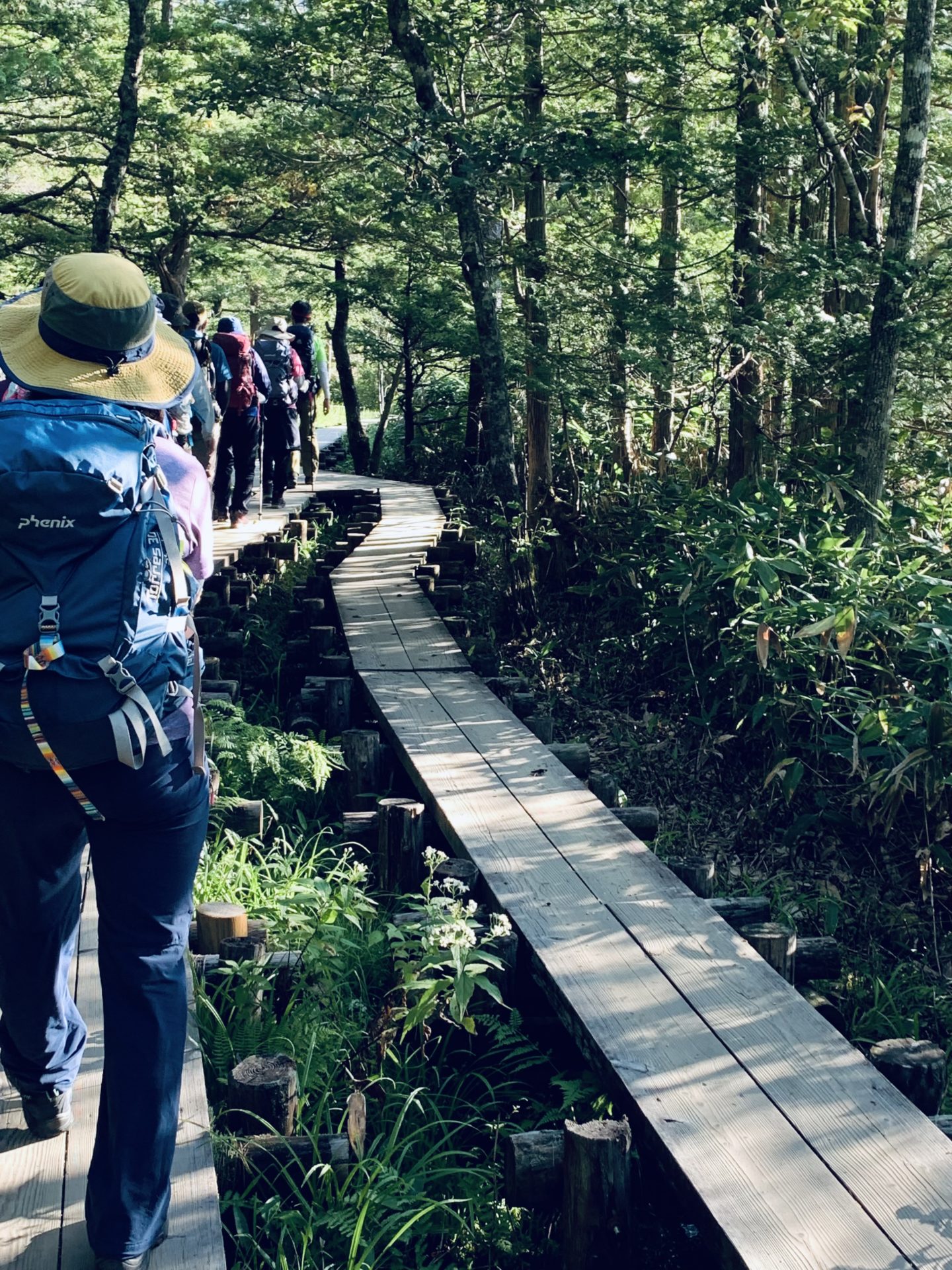 1日目/6:45立川北口公園集合、6:55出発(貸切バス)=9:50〜10:20スーパーつるや=11:45上高地BT→12:05山研着、12:30昼食、13:30山研発→13:40〜50ビジターセンター→14:45〜55明神館→穂高神社奥宮→岳沢湿原→16:25山研着、18:00〜20:30夕食&交歓会、(〜21:40有志二次会)、22:00消灯