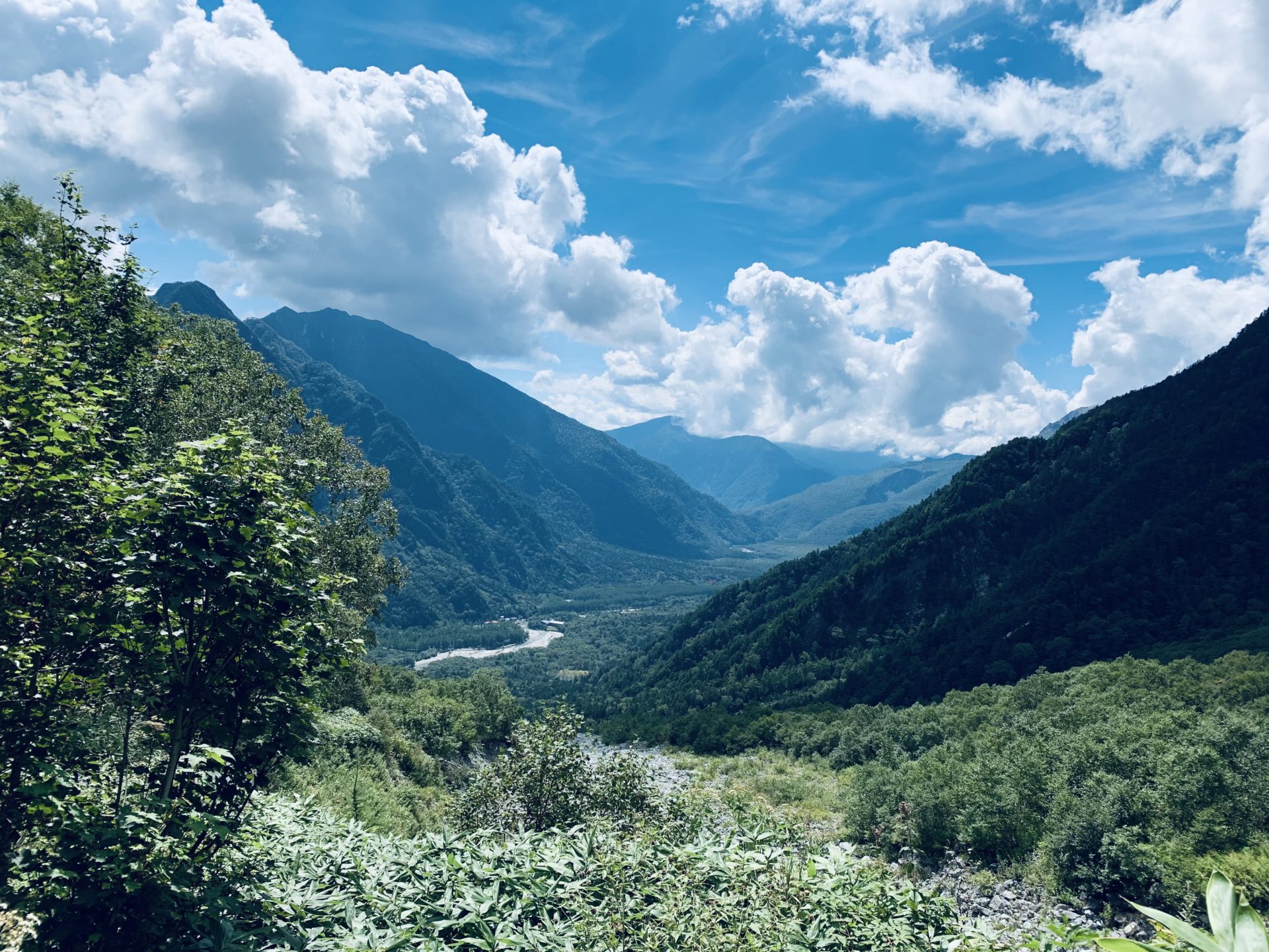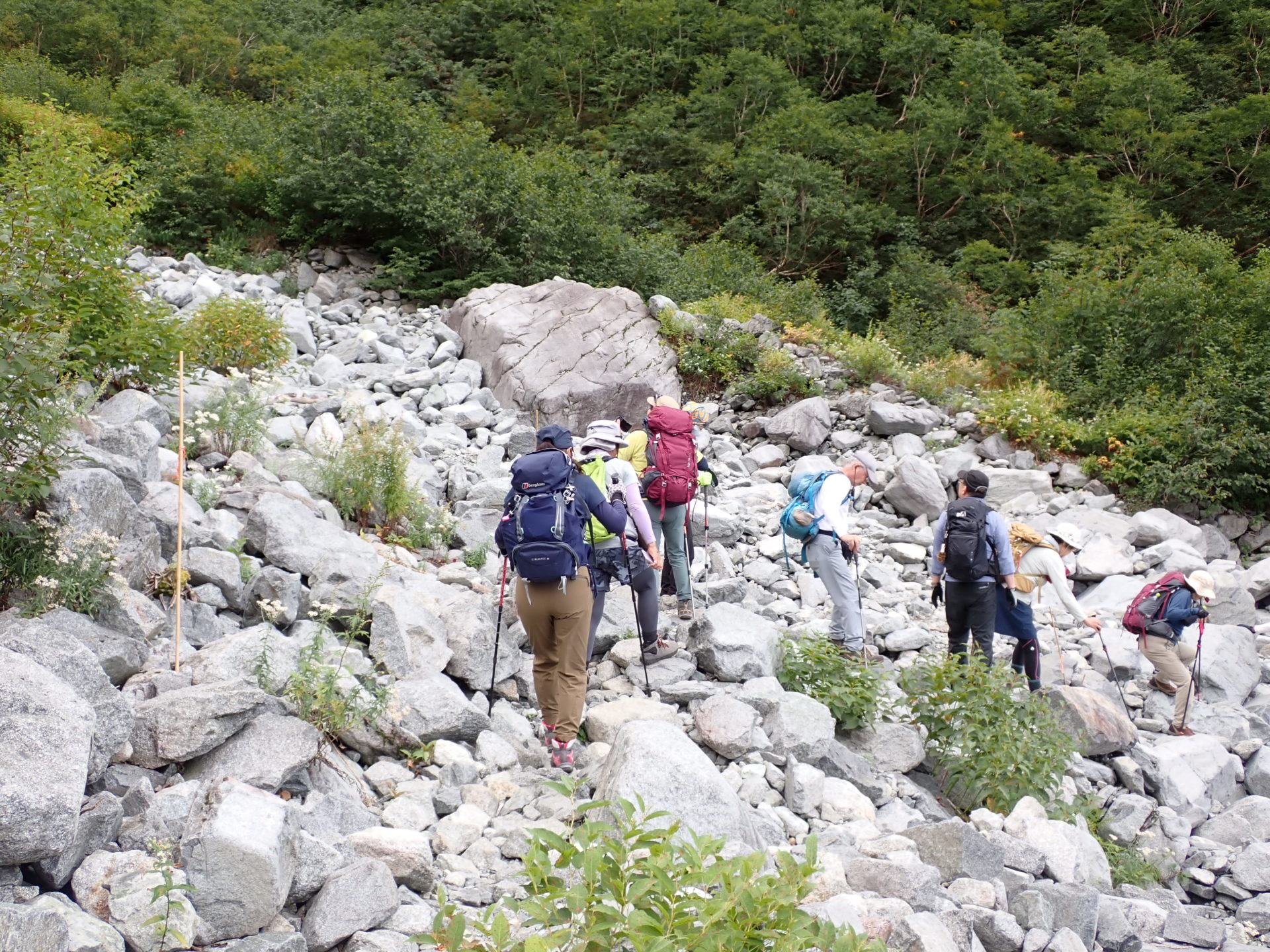 ◇2日目/4時に起床し、日の出を見に河童橋へ。前日に見られなかった中秋の名月が焼岳の右肩に輝いていた。宿泊者にしか体験できない時間を皆楽しんだようだ。朝食後、岳沢に向けて出発。標高差約700mを一気に登るにはペースが大切である。滑りそうな木の根や岩場などへ注意喚起しながらゆっくり高度を上げる。岳沢に出ると視界が開け、西穂高岳から吊り尾根、眼下には先ほどまでいた上高地が臨めた。ここでエネルギーをもらい、岳沢小屋を目指す。天気予報が良い方に外れ蒸し暑いくらいの好天。10:25岳沢小屋着。昼食休憩を長めに取り、眺望を満喫しながら身体を休めた。集合写真撮影の後,往路を戻る。脚の疲れや慣れない岩場の歩行で予定より時間がかかったが、上高地の自然に励まされ無事下山することができた。