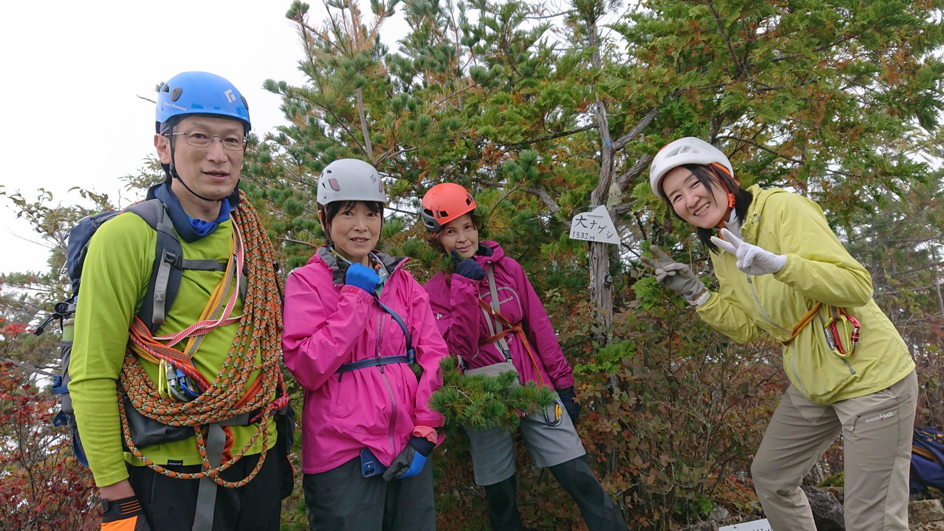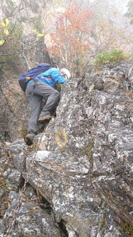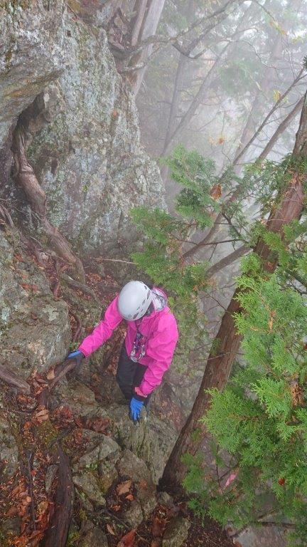 青空から一変雨となり、濡れた落ち葉とその下に隠れた木の根に苦戦しました。鎖場・岩場をへてたどりついた大ナゲシの頂上は眼下が真っ白で眺望こそ望めませんでしたが、達成感がありました。
