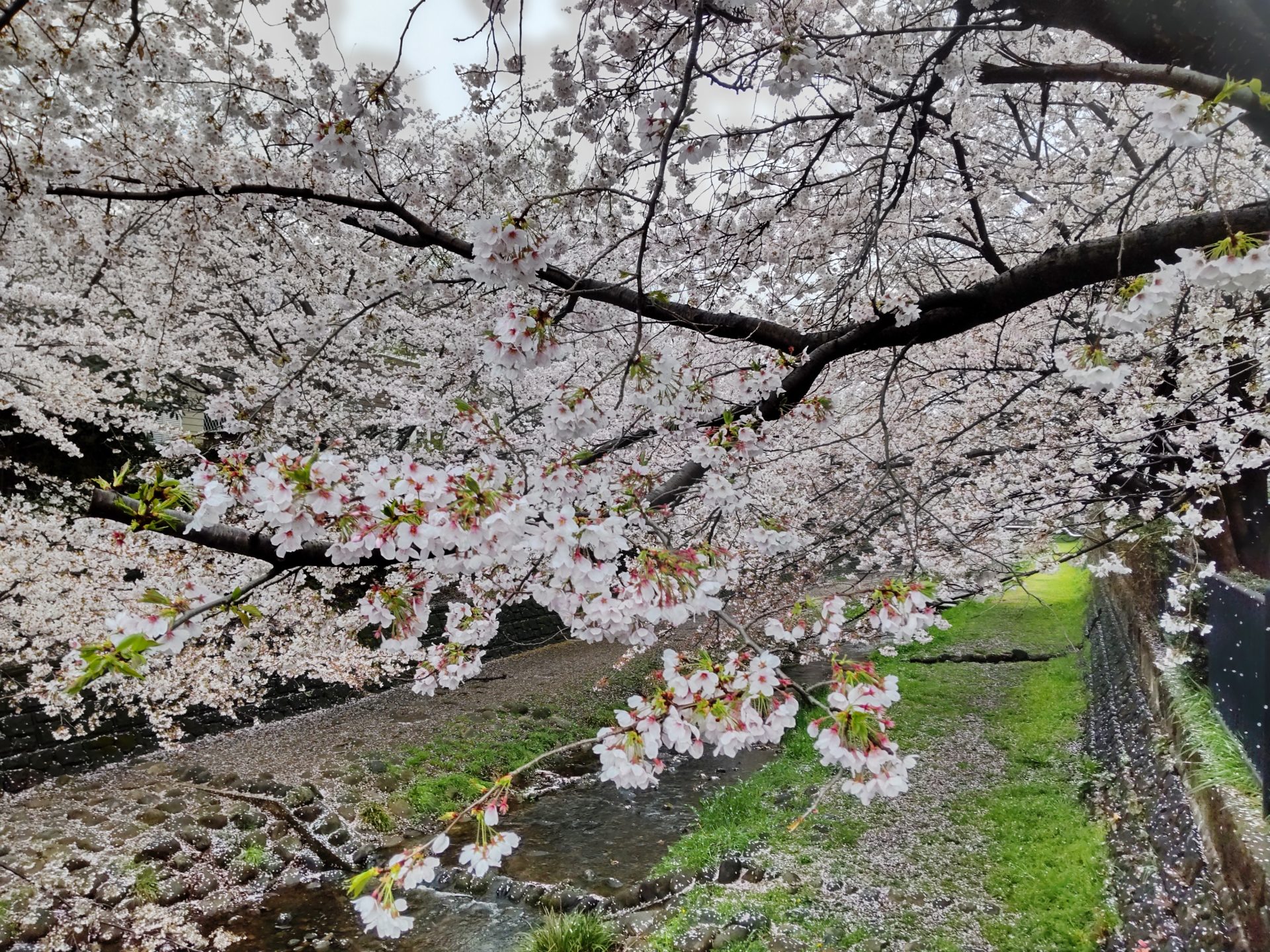 住宅街を縫うように流れる野川は知る人ぞ知る桜の宝庫だった。川面を包み込むように咲く鮮やかなピンクの枝垂れ桜、定番のソメイヨシノ、白い花弁のオオシマ桜など美林が延々と連なる。新緑の始まった柳などの木々や、鮮烈な黄色のレンギョウが目を楽しませてくれた。雨上がりを喜ぶヒヨドリやシラサギ等の鳥たちも続々と姿をみせてくれた。
