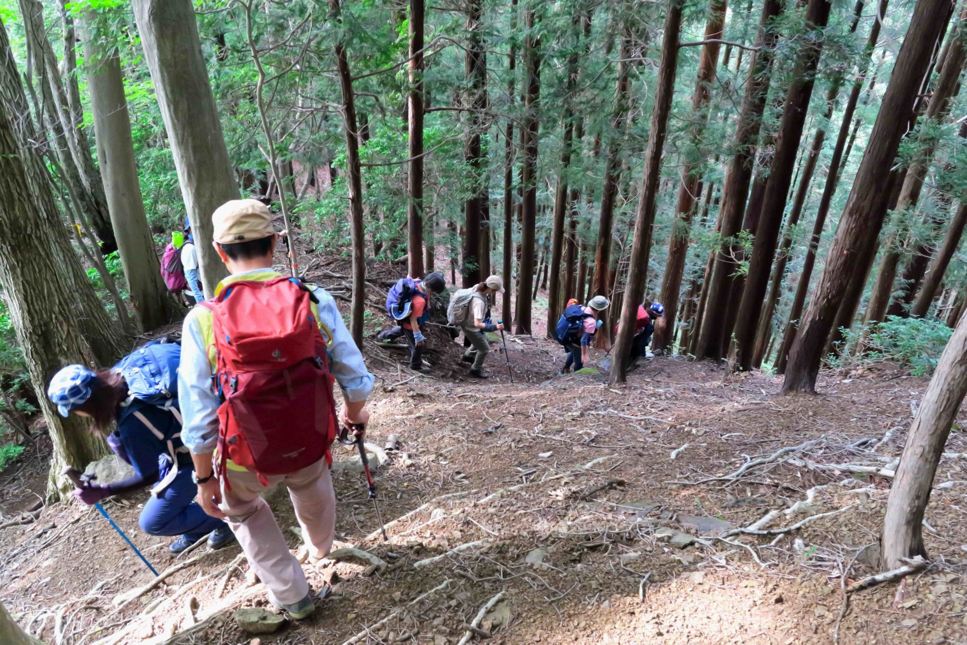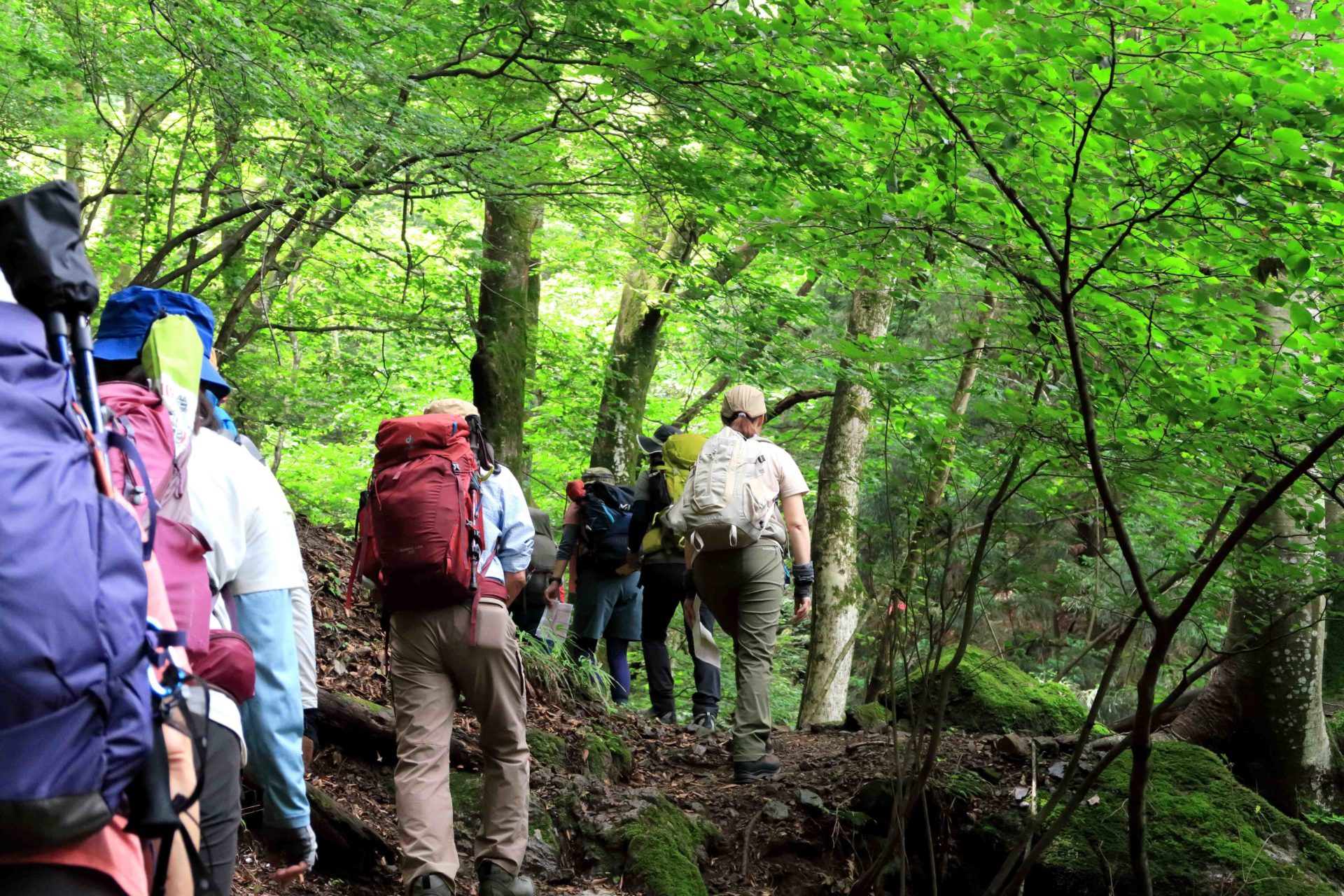 下山はバリエーションルートで、地図を見ながら尾根をたどる。急坂をゆっくりと慎重に下る。斜度が緩やかになってホッとしていると、突然リーダーからトランシーバーで伝令があり慌てる新規スタッフ。この先のルートや周りのメンバーの様子などを質問され、それぞれ慣れない手つきでトランシーバーを操作し応答した。
