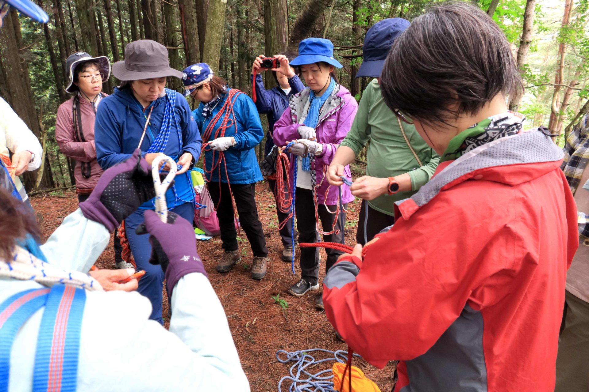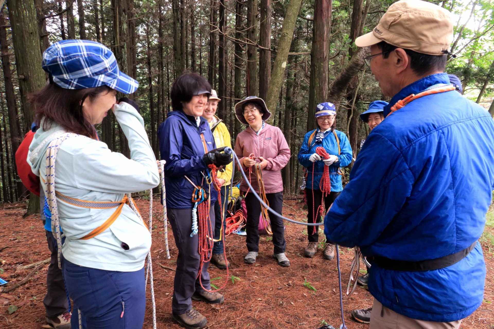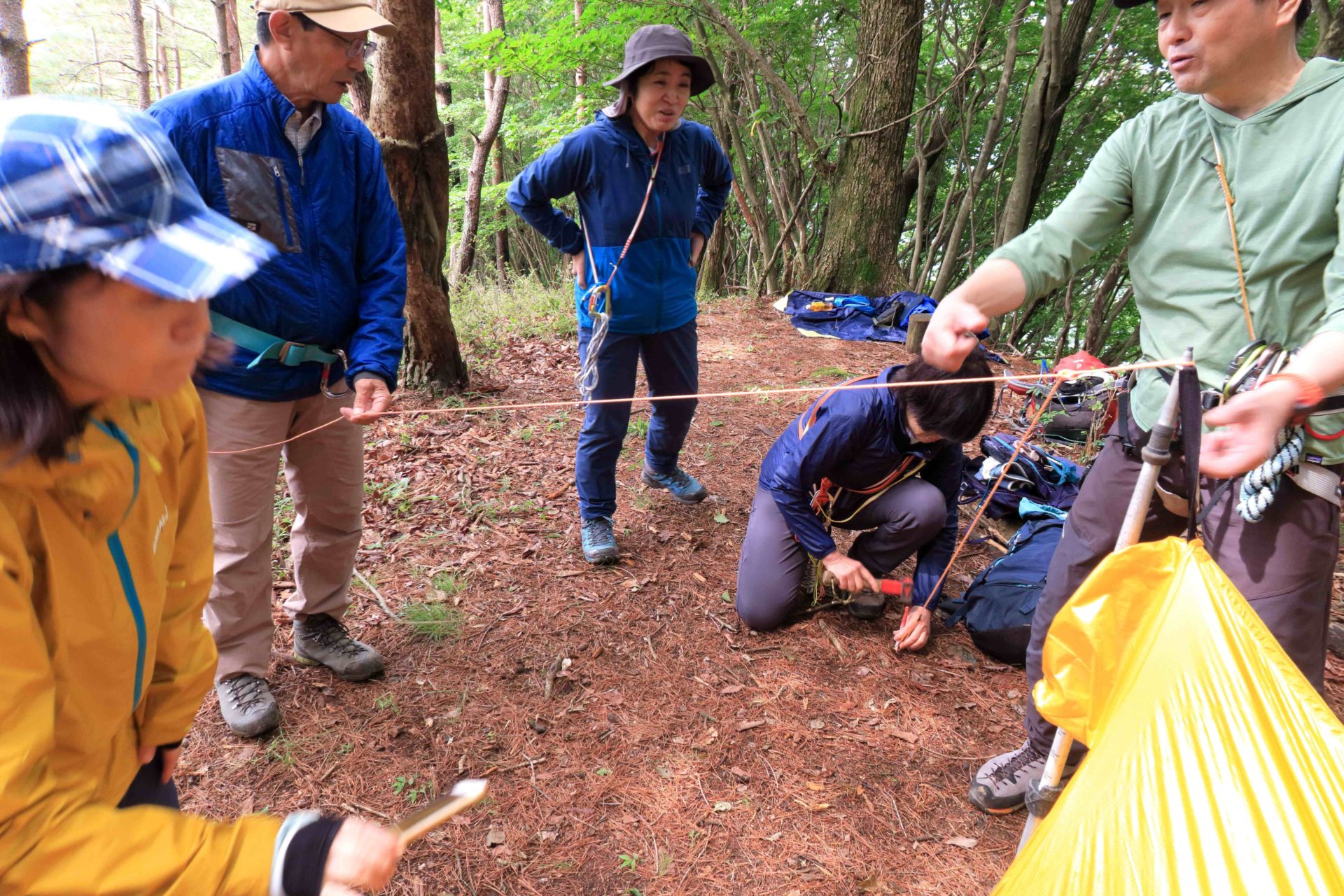 関東も梅雨入りし天候が心配されたが、芦ヶ久保駅では青空も見え、これから登る二子山を眺めて地形の概念を捉える。登山教室新規スタッフにトランシーバーが配られ使い方の説明を受けると、一気にスタッフとしての責任感が湧き上がってきた。準備運動では、指導することを念頭において動かす箇所をしっかり意識する。地図で現在地、目的地の確認、高度計の調整をし9:45出発。登山口は間違えやすいので慎重に確認してから進むように、と宮崎講師。ピークや川を渡る箇所、分岐や大きく曲がった道など特徴のある場所で立ち止まって地図読みをする。地図に尾根と谷に色分けしたラインを入れるとわかりやすくなる。自分の位置が特定できるようになると次第に地図読みが楽しく感じてきた。歩くペースも大切で時間あたりの歩数を計算してペースを考えながらゆっくり歩く。登山教室の受講生と歩くことを想定していると緊張感が続くが、ミソサザイやアオバトの鳴き声が聞こえてきて気持ちが和らげてくれた。二子山山頂には向かわず、一般登山道から外れた岩菅山にて昼休憩。その後ロープの結び方、ツェルト設営の練習。基本的なロープの結び方(エイトノット)は各自覚えてから臨んだが、ロープにも太さや強度、伸縮性など性能に違いがあり、多種多様な使い道があることを教わる。細い紐ながら2.2トンの強度もあるというスリングとカラビナで簡易ハーネスを作る。体にしっかりと固定され、簡易とはいえ安定感があり、自分の体に巻きつけ何度も練習を繰り返した。