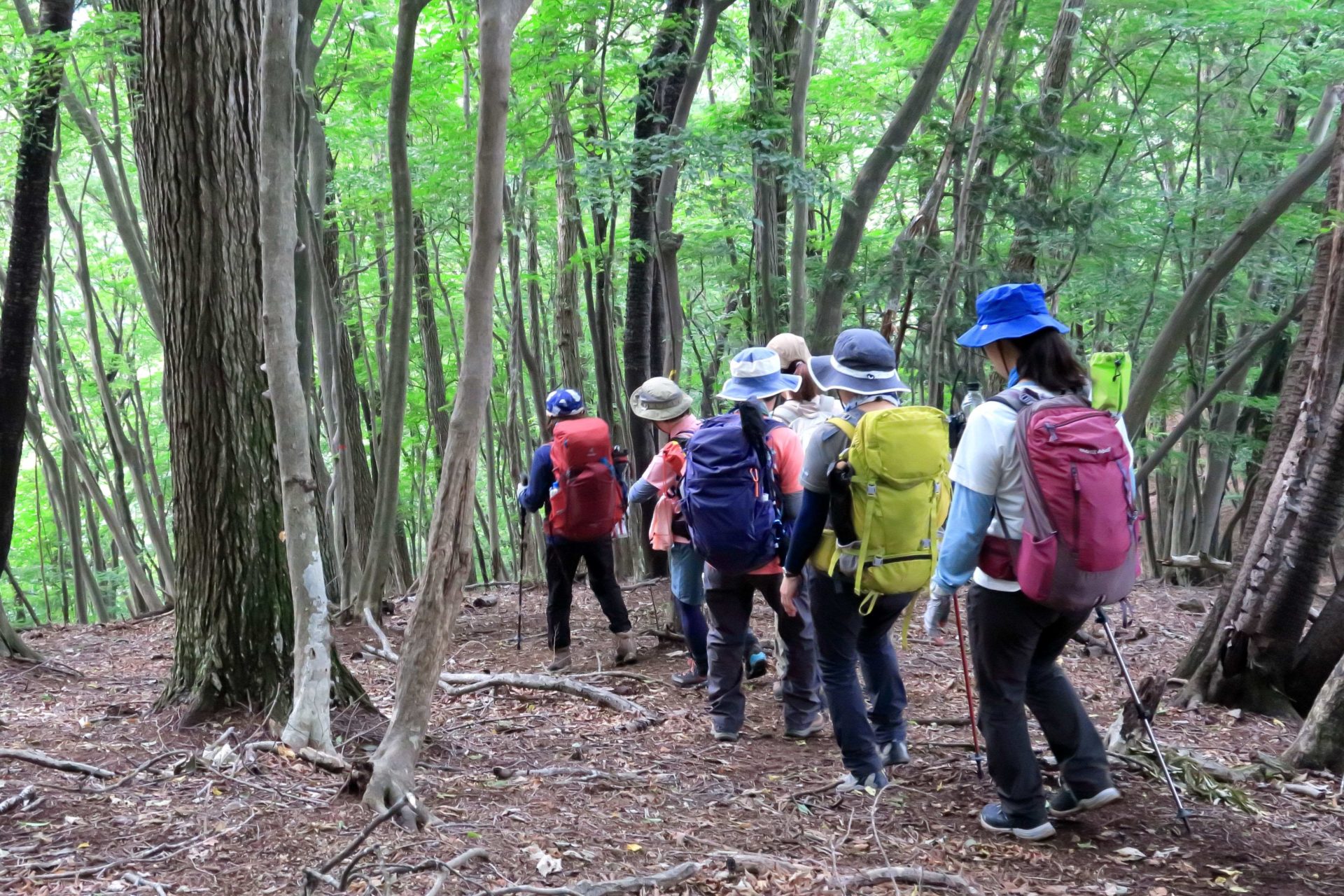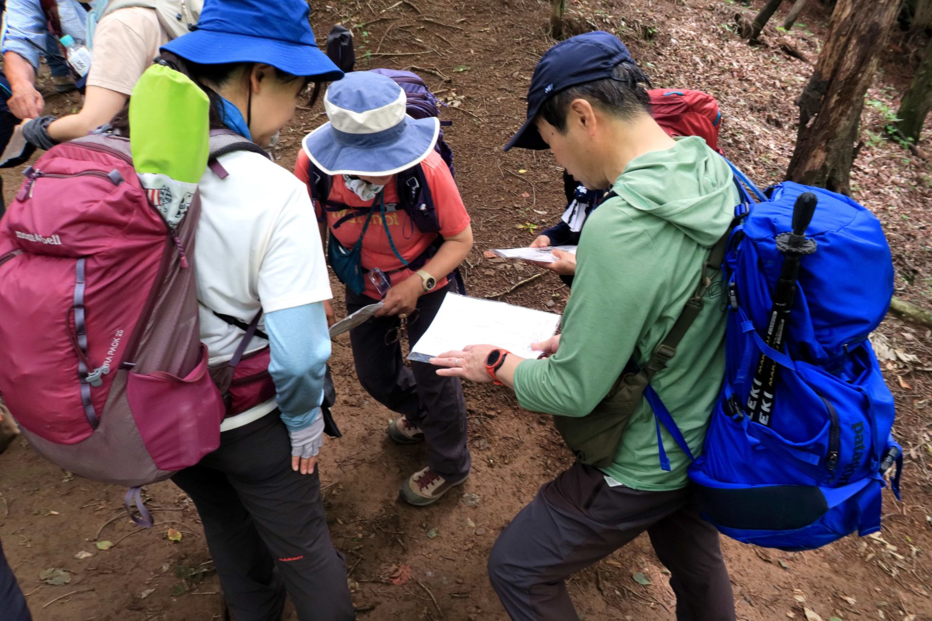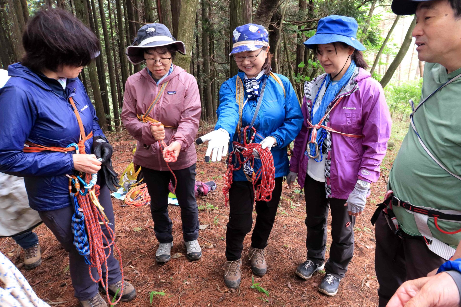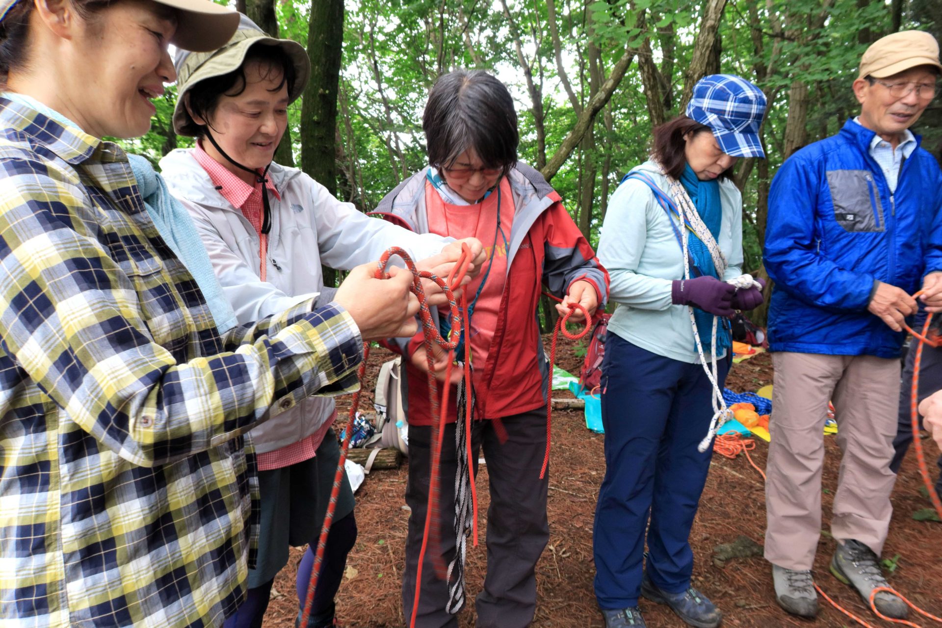 関東も梅雨入りし天候が心配されたが、芦ヶ久保駅では青空も見え、これから登る二子山を眺めて地形の概念を捉える。登山教室新規スタッフにトランシーバーが配られ使い方の説明を受けると、一気にスタッフとしての責任感が湧き上がってきた。準備運動では、指導することを念頭において動かす箇所をしっかり意識する。地図で現在地、目的地の確認、高度計の調整をし9:45出発。登山口は間違えやすいので慎重に確認してから進むように、と宮崎講師。ピークや川を渡る箇所、分岐や大きく曲がった道など特徴のある場所で立ち止まって地図読みをする。地図に尾根と谷に色分けしたラインを入れるとわかりやすくなる。自分の位置が特定できるようになると次第に地図読みが楽しく感じてきた。歩くペースも大切で時間あたりの歩数を計算してペースを考えながらゆっくり歩く。登山教室の受講生と歩くことを想定していると緊張感が続くが、ミソサザイやアオバトの鳴き声が聞こえてきて気持ちが和らげてくれた。二子山山頂には向かわず、一般登山道から外れた岩菅山にて昼休憩。その後ロープの結び方、ツェルト設営の練習。基本的なロープの結び方(エイトノット)は各自覚えてから臨んだが、ロープにも太さや強度、伸縮性など性能に違いがあり、多種多様な使い道があることを教わる。細い紐ながら2.2トンの強度もあるというスリングとカラビナで簡易ハーネスを作る。体にしっかりと固定され、簡易とはいえ安定感があり、自分の体に巻きつけ何度も練習を繰り返した。
