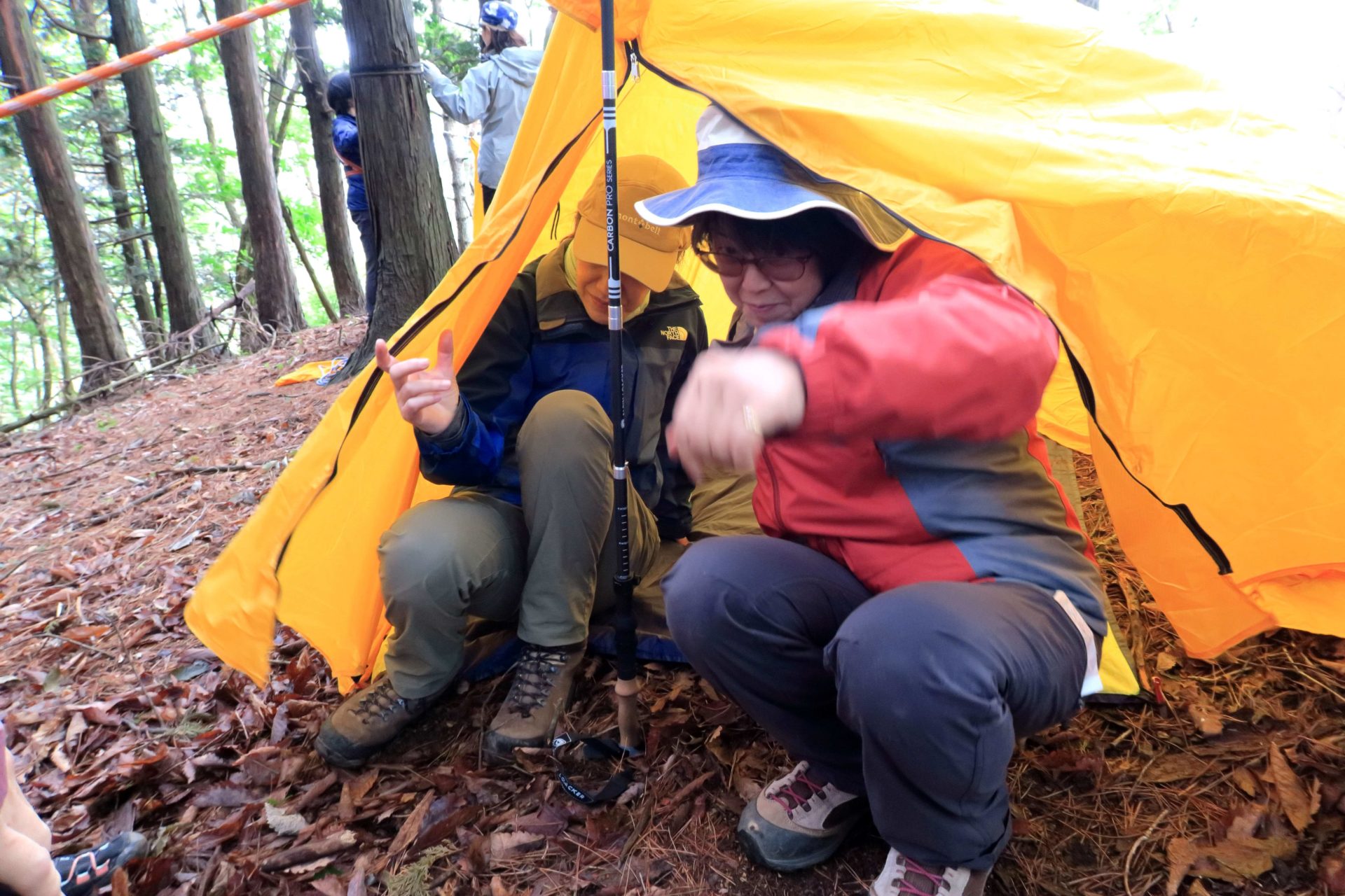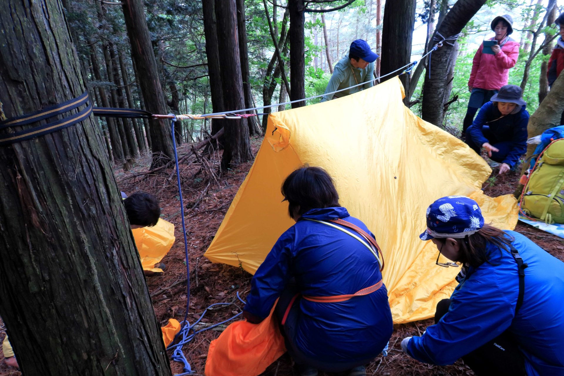床にペグを打ち込んでしっかり固定し、ロープも様々な結び方を駆使してあっという間に設営され、宮崎講師と中村(正)講師の手際の良さに驚かされる。中に入ってみると日差しと外気が遮られ、狭いながらも快適な空間になっていた。