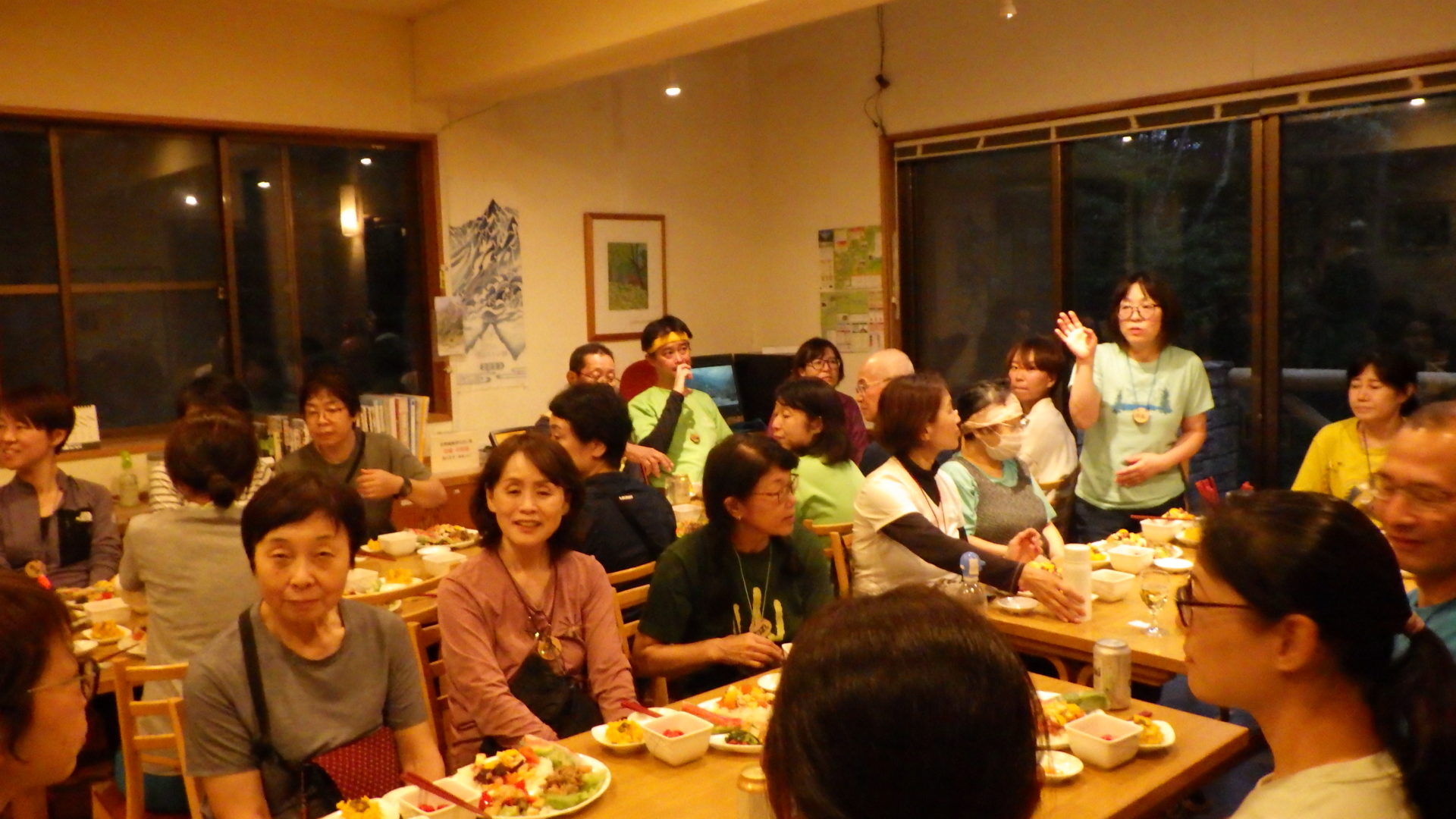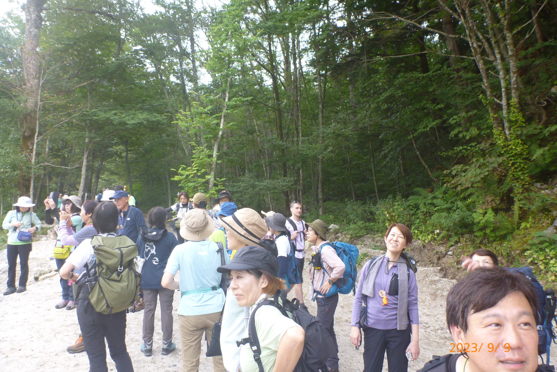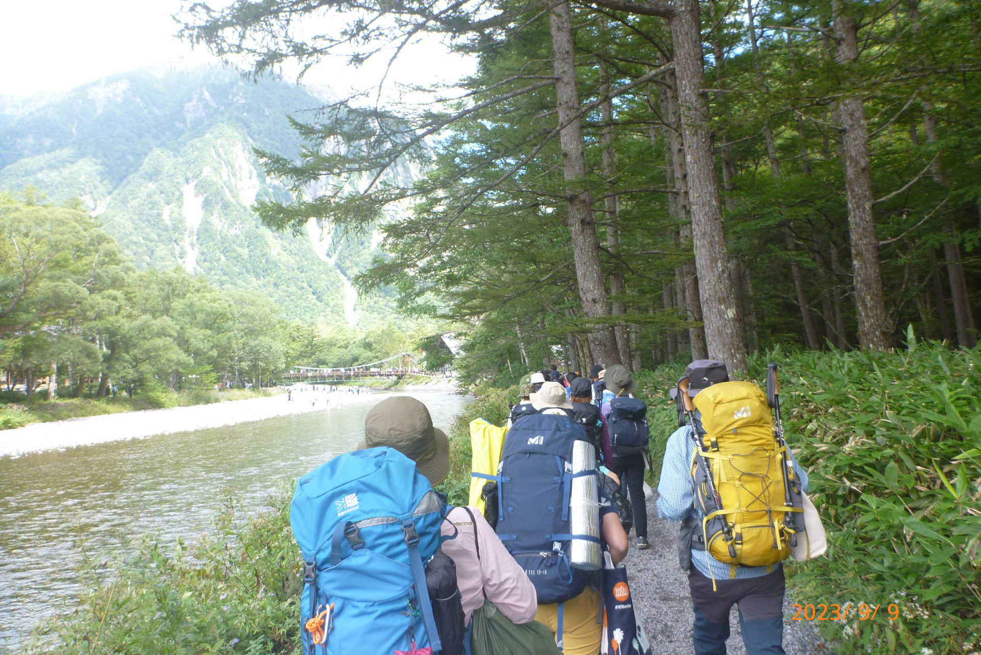 *1日目* 今回の宿泊山行は山研の人数制限や、台風の接近と不安から始まった。管理人さんのお手伝いで河野さんが当日朝から山研へ行くことになり、2日前の天気予報で台風は通り過ぎる事や、スタッフの人数も確保でき安心して立川を出発した。松本のスーパーでの買い出し、受け取った食材を見ると夕飯が待ち遠しくなった。山研に着き昼食をとり明神池まで散策に出かける。足早に梓川左岸を行く道端にはサラシナショウマ・ノコンギク(白・紫)がたくさん咲いていた。穂高神社奥宮ではウェストンと嘉門次さんの二人一緒の写真が山研にあると説明。岳沢湿原を通り16:30に戻る。夕食は栄養豊富な料理がならび、ビール以外の飲み物を準備忘れで直ぐ用意できず缶ビールと空コップで乾杯、大変失礼しました。自己紹介では受講生の意気込みが伝わってきた。二次会各々盛り上がり、天の川もわかるほどの満天の星を見に行き、22時少し過ぎ就寝。