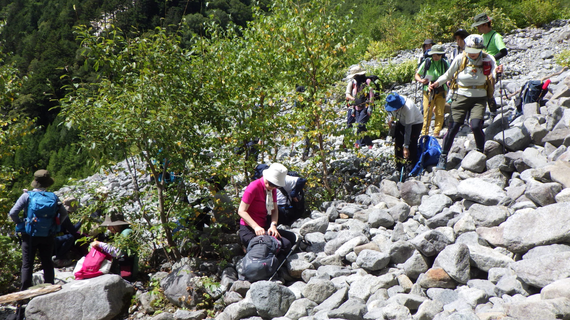 *2日目* 早朝、調理場からの音で目覚め、各自準備をする。お腹いっぱいの朝食後ミーティング。天気はまずまずだが、朝食後の掃除を今回に限り無くなり、12時頃に雨予報なので出発時間を15分早めた。登山口に着くころには暑くなり風穴からのクーラーが気持ちよい。動く石に注意と声かけながら登る。西穂から前穂、乗鞍まで眺め山座同定、岳沢小屋ではゆっくり過ごし、10:30下山開始。岳沢の見晴らし台まで降り休憩。まだまだ日向は暑い。下山時、石車に乗って尻もちや、ストックが縮んだために転倒も有ったが、大きな怪我無く下山。歩行ペースは順調で予定時間通り山研到着。整理体操後各自バスターミナルへ。最後ひと騒動あったが、梓水宛で汗を流し、一日天気に恵まれて、宿泊山行が終わった。山研にまた来たいとの声も多く聞かれた。今までの班編成を入れ替え受講生の懇親もでき、休憩時間の使い方も歩き方も慣れて来て、益々成長を感じた。