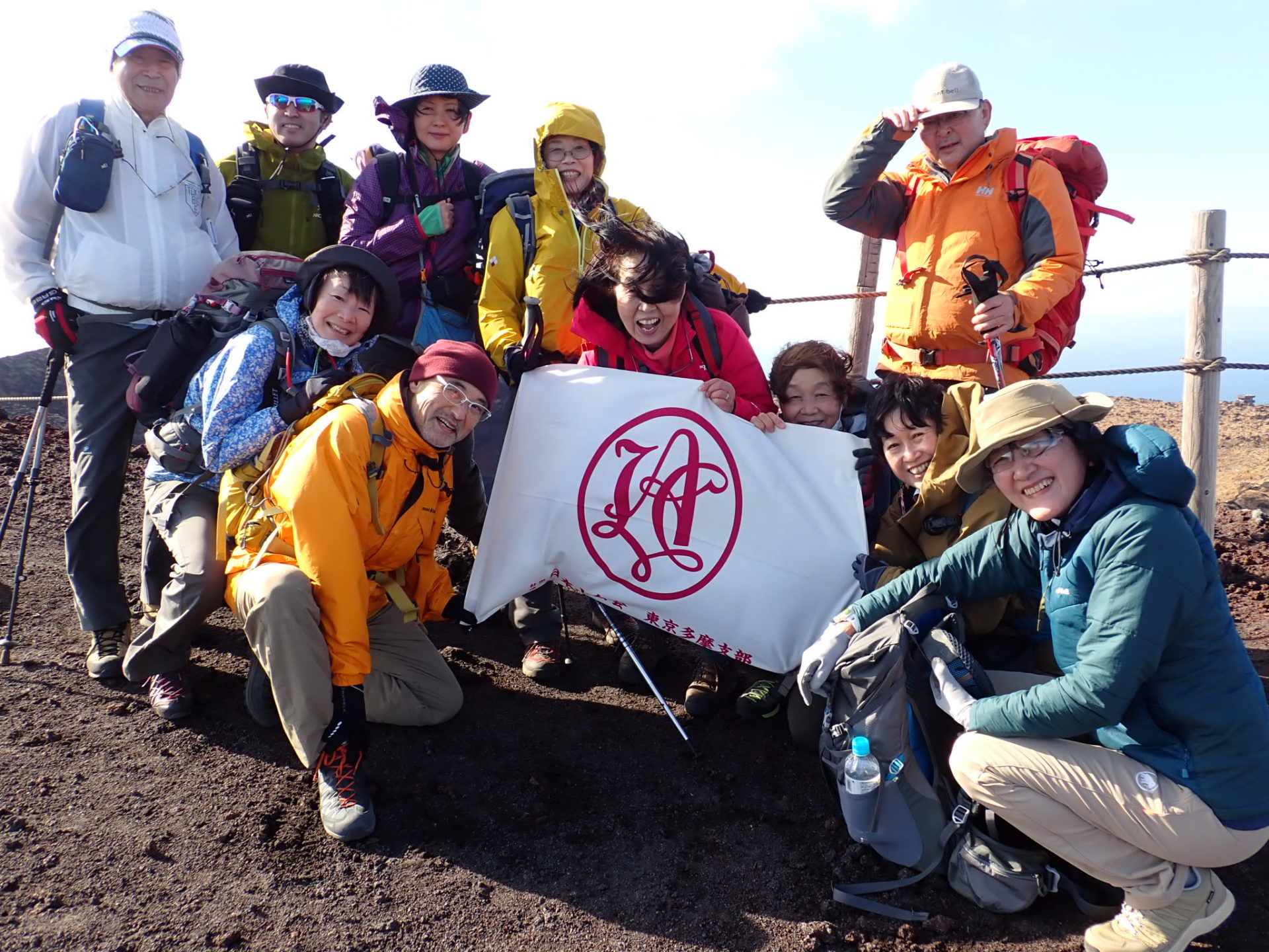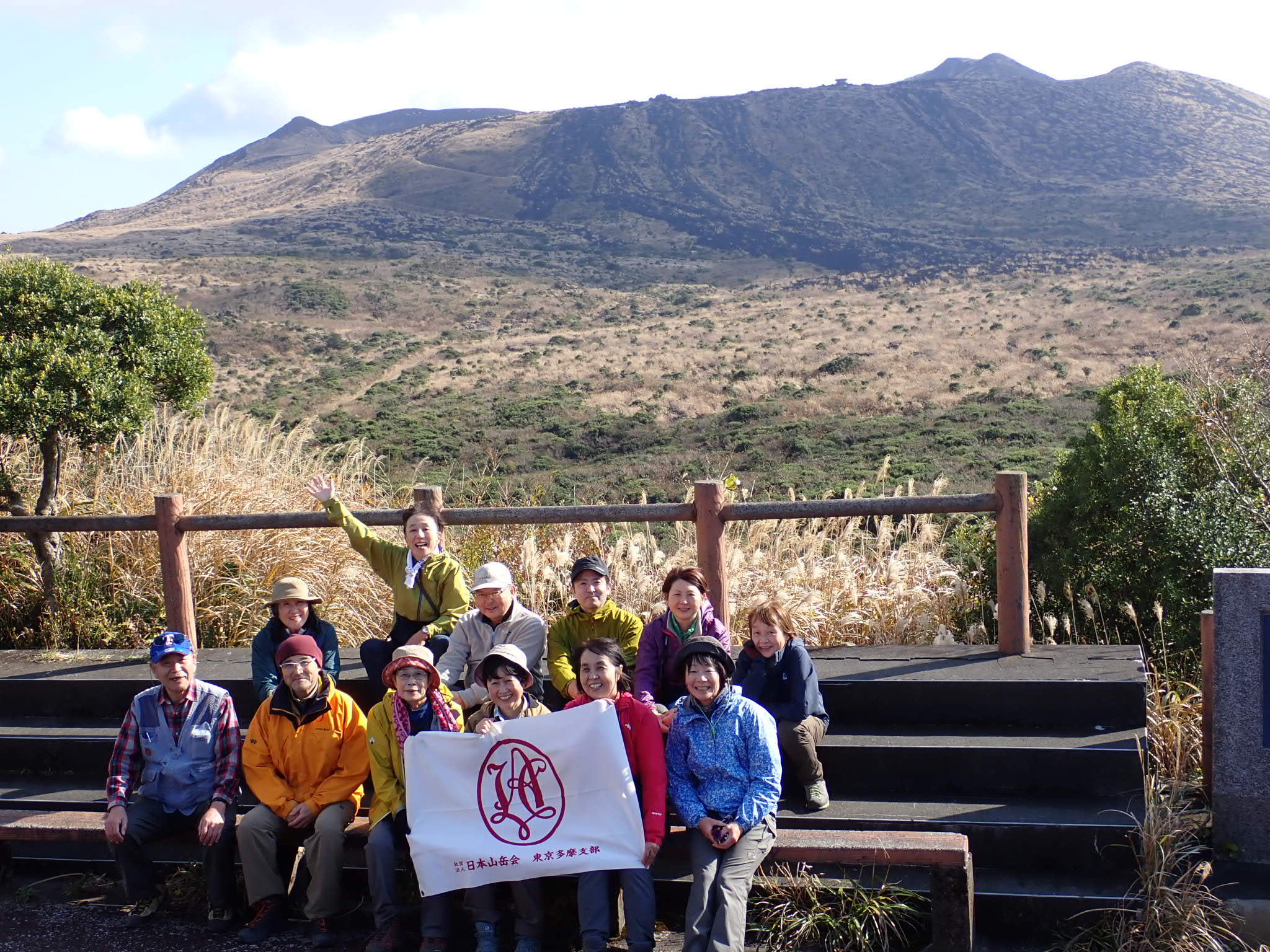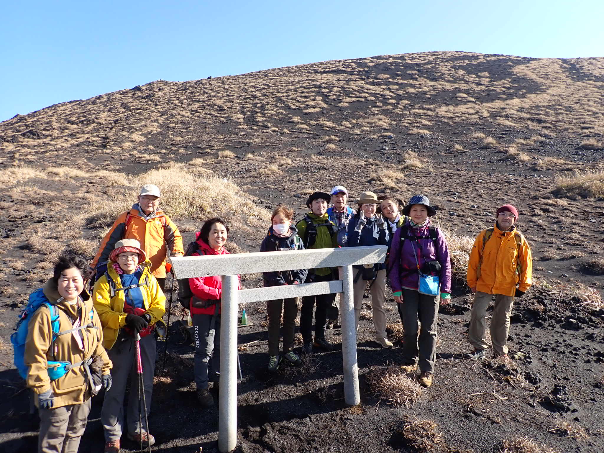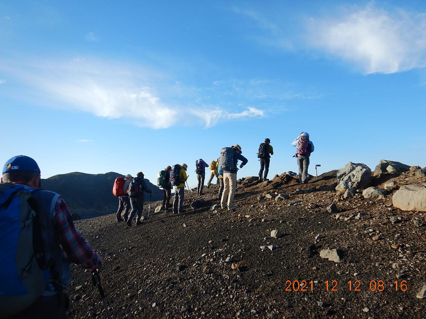 20:45に東京竹芝桟橋に集合しリーダーから山行の概要及び注意点の説明を受ける。当日の検温申告を行い自己紹介後、21:45乗船開始。船上で夜の東京湾の景色を楽しむ。翌日6:00岡田港下船。まだ暗い。天気は気温7~12度、風速10~12mとの予報。三原山温泉バス停に着くまでの車中で雲の隙間から朝日が昇るのが見える。大島温泉ホテルの敷地内のバス停で下車。ホテルの厚意でトイレを借りる。風が強いのでホテルの敷地内のシェルターの中で腹ごしらえをする。装備を調え7:10大島温泉ホテル登山口を出発。濃いピンクの花をつけたサザンカのトンネルの登山道を歩く。しばらくすると景色がススキに変わる。そしてさらに進むと荒涼とした砂漠のような景色が目前に広がる。樹木はなく足下は軽石のザレ。茶色の砂山と青空のコントラスト。登山道がないのでGPSを頼りに前へ進む。最初のピーク櫛形山を目指して登る斜面で振り返ると富士山と伊豆半島が綺麗に見える。ここから風が強くなり出す。櫛形山の頂上では暴風。風を避けるために早々にザレの斜面を降りると景色が一変する。海に面して鉄分が赤く酸化した溶岩壁の広がる渓谷「赤ダレ」や昭和17年まであったレールの上の箱に乗って滑り降りる遊具の跡が残る「滑走台跡」を経由して着いた展望台で昼食。屋上からは伊豆の島々が見える。風が強く展望台内で早々に食べ終わり歩き出す。ここからお鉢回り。遮る物がない道、ますます風が強まりロープにつかまらないと前に進めない。11:30この日の最高峰749m剣が峰に到着。直径300m深さ200mの大迫力の火口を背にして風にあおられる支部旗が飛ばされないようにしながら記念撮影。三原神社目指してすぐに下山開始。途中、割れ目噴火口から立ち上る水蒸気を見て活火山を実感する。20分後三原神社に到着。ゴジラ岩を見学して御神火茶屋に向かう。ここからは樹木の中緩やかな下山。12:25御神火茶屋に到着。小野委員長から強風対策のレクチャーを受けその後解散。風での体力消耗を実感する貴重な山行となった。