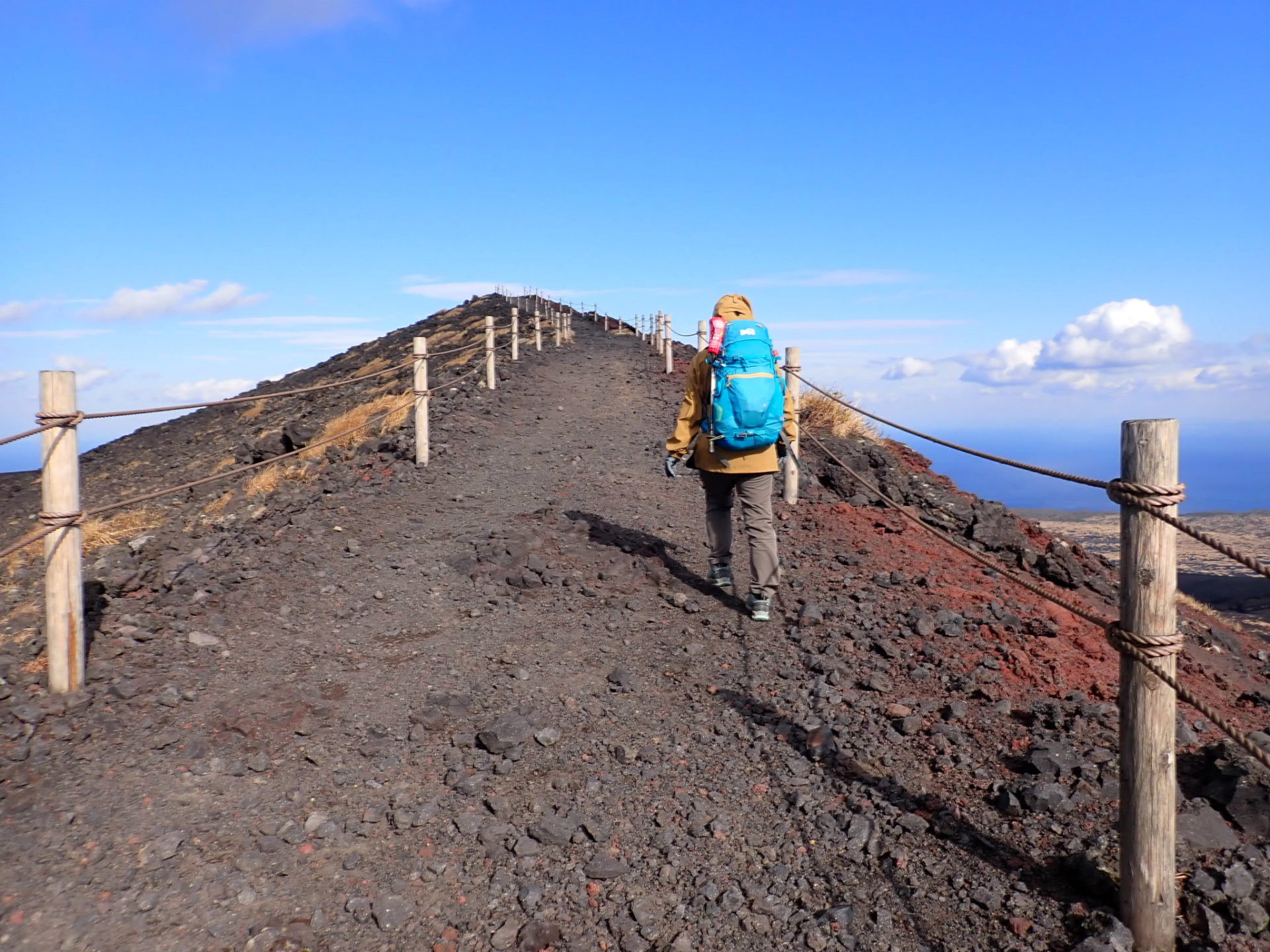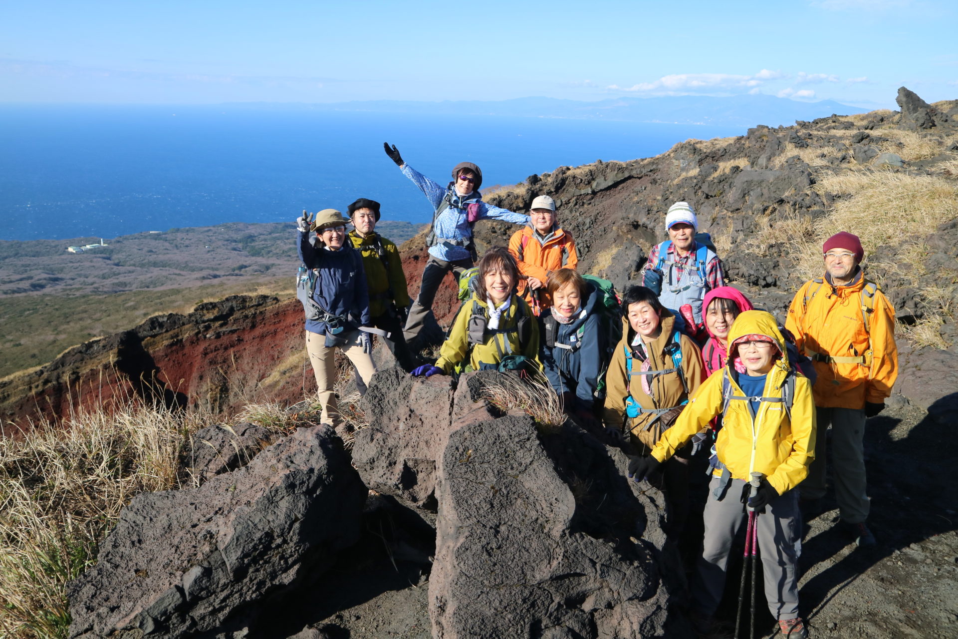 翌日の早朝、大島に到着。清々しい温暖な天気でしたが、強風に悩まされる。しかし、火山岩の道を強風で吹き飛ばされそうになりながら歩いた先の巨大な火口は迫力満点でした。最後に、鳥居越しに見事な富士山も眺めました。山岳会に入会したばかりで初参加の山行でしたが、和やかで、なかなか思いつかないようなダイナミックな大島、三原山はとても楽しい山行でした。