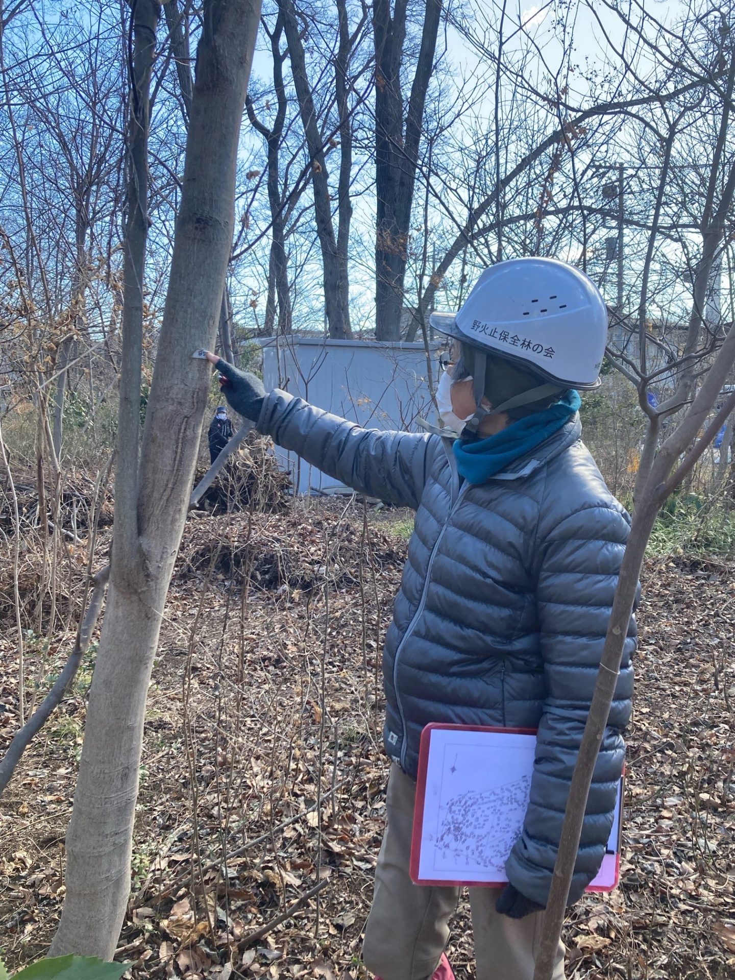 (樹木調査)定例作業前にナンバーリングした樹木の確認を行った(参加者3名)