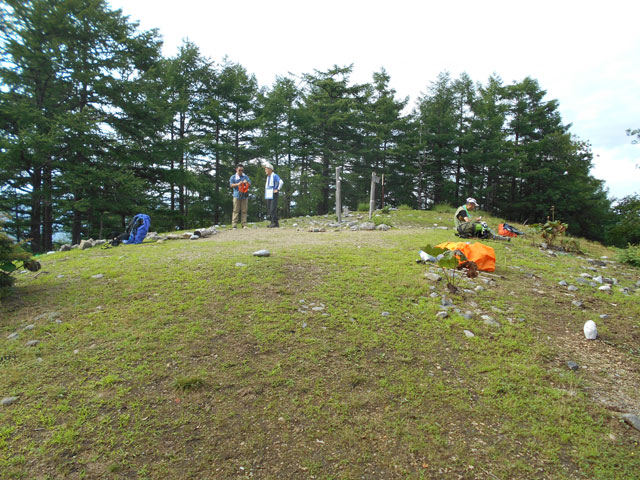 やがて尾根道と巻道が一度は接するが、すぐに分かれる。尾根道のなだらかな坂を登り切ると高丸山(1,733m)に着く。名前の由来が「頂き部分が丸みを持っている」といわれているように、いかにものどかな山だ。右折して防火帯の中に作られた急な道を下り、さらになだらかな道を登り切ると日蔭名栗山(1、725m)に着く。