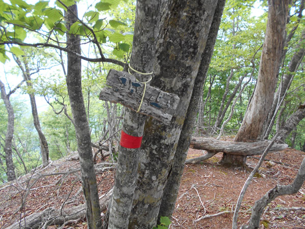 防火帯の尾根道は、この道標の裏の方向にあり、かすかに踏み跡が残っているのだが、道標には何も表示されていない。この踏み跡をたどって進むと、これ以上高い場所がないと思われるところに、何とか「三ノ木戸山」(さぬきどやま/1,177m)と読める古い小さな木片が切り株に紐で括りつけられている。