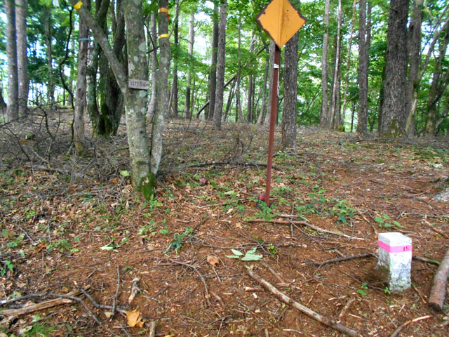 七ッ石山を越えて東に下り、小屋からの道と合流すると100mほどで尾根道と巻道に分岐するが、分岐点には標識がない。尾根道は左の尾根へ続くわずかな踏み跡がある程度で、気が付かないと右の樹林帯の広い巻道に入ってしまう。