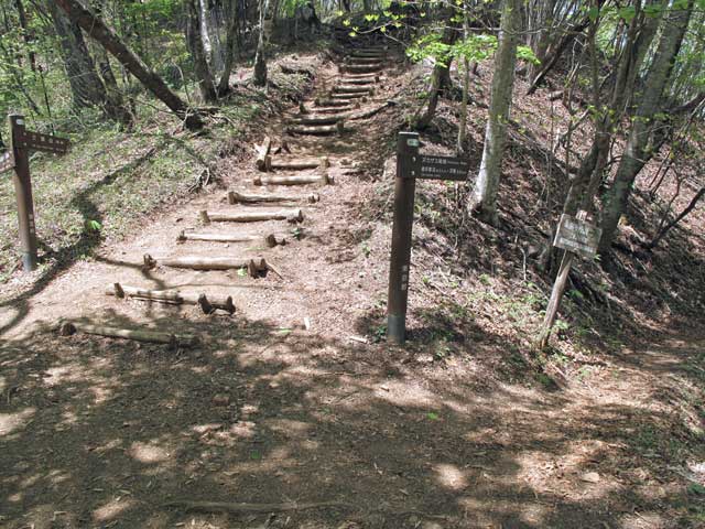 鶴峠への分岐を右に分けて大岩の間を抜ける。丸太の階段を登って行くと、左の道とまっすぐ尾根を直登する踏み跡が分かれている。地図上は左に進み御堂峠に至るのが正規のルートだが、道幅が狭く、荒れて滑りやすい危険な箇所もある。展望のよい西蜂へ直接登れる尾根道の方が歩きやすく、こちらの方が多く利用されているようだ。