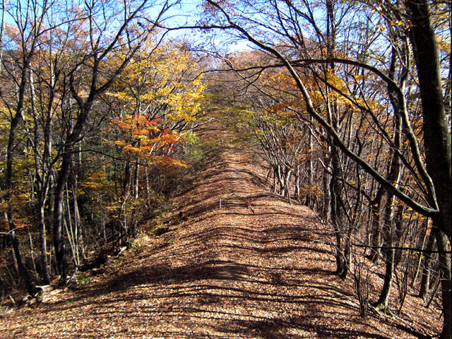 サス沢山からは緩やかな上り下りが1時間ほど続く。たまに大きな岩を巻いて登るところもあるが、概してブナやミズナラの綺麗な広めの尾根道だ。惣岳山の近く、あと30分足らずのところまで来ると最後の急登になる。谷のように深く掘れた尾根の左をトラバースするように登る。尾根の両側にコバイケイソウが群生していて、春には御前山のシンボルとなったカタクリがところどころに見られる。以前は最盛期に登山道の脇まで溢れるほど咲いているのが見られたのが、盗掘や鹿の食害で、よく探さないと見つからないほど少なくなった。早春にはキブシ、マンサク、アブラチャン、ダンコウバイなどの木々がいち早く黄色い花を咲かせて登山道の脇を彩る。