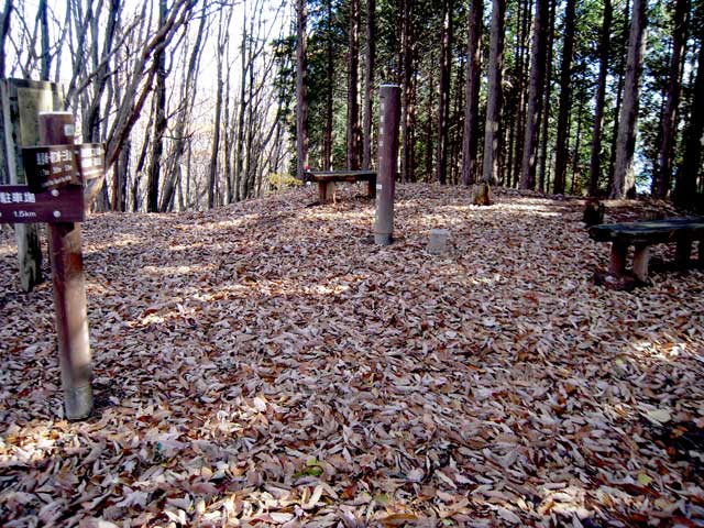 小河内峠からは、一般的には巻道を行くが、尾根筋をたどって、水窪山(1,040m)と天神山(1,045m)を踏んでおこう。水窪山への登りは急で滑りやすいが、尾根に上がれば明るく気持ちのよい道となる。巻道と合流し、最後の急登を終えると月夜見第二駐車場に出る。ここから奥多摩周遊道路を10分ほど歩くと左側に月夜見山への標識があり山道に入る。さらに10分ほどで山頂に着く。頂上は標識とベンチ、三角点があり、左側は植林のスギ、右側は広葉樹に囲まれ展望はない。月夜見とは優雅な名前だ。「月読命」から来ているのだろうか。